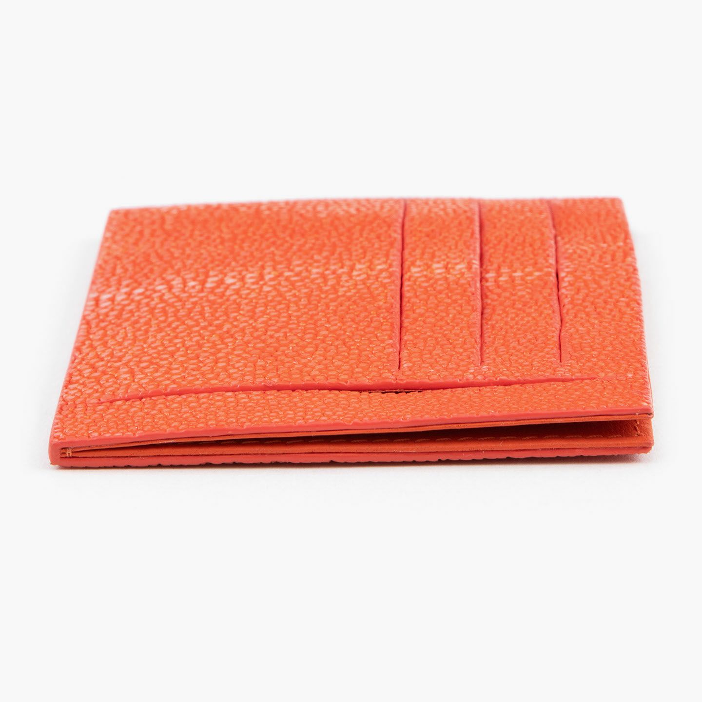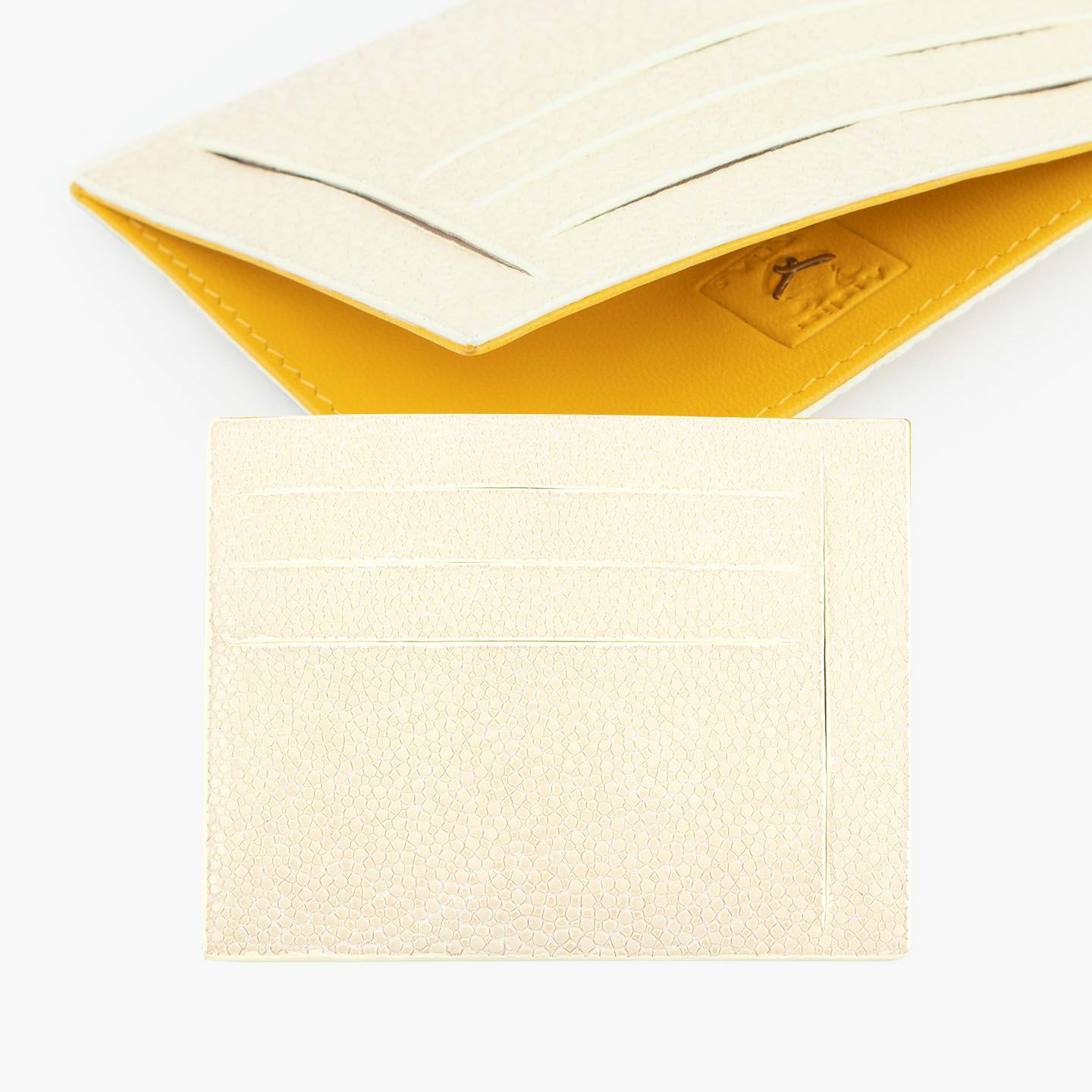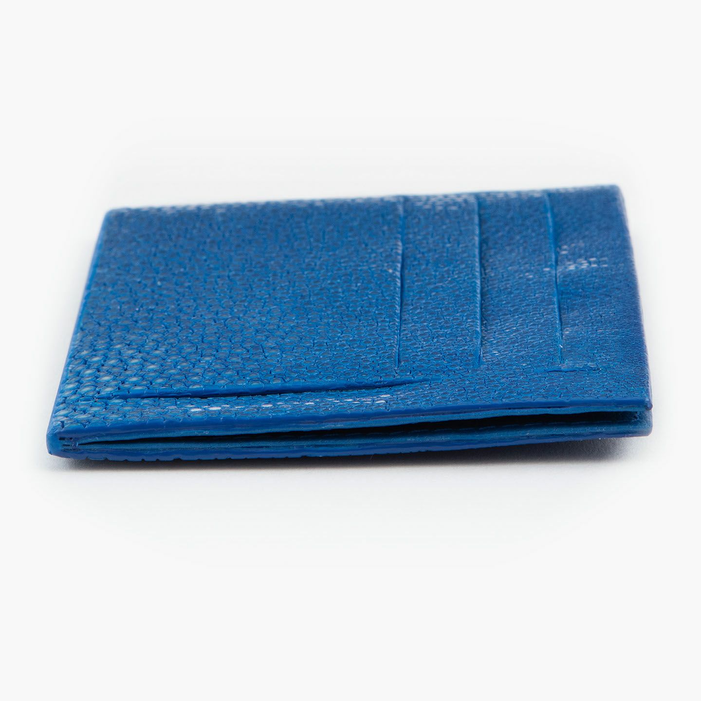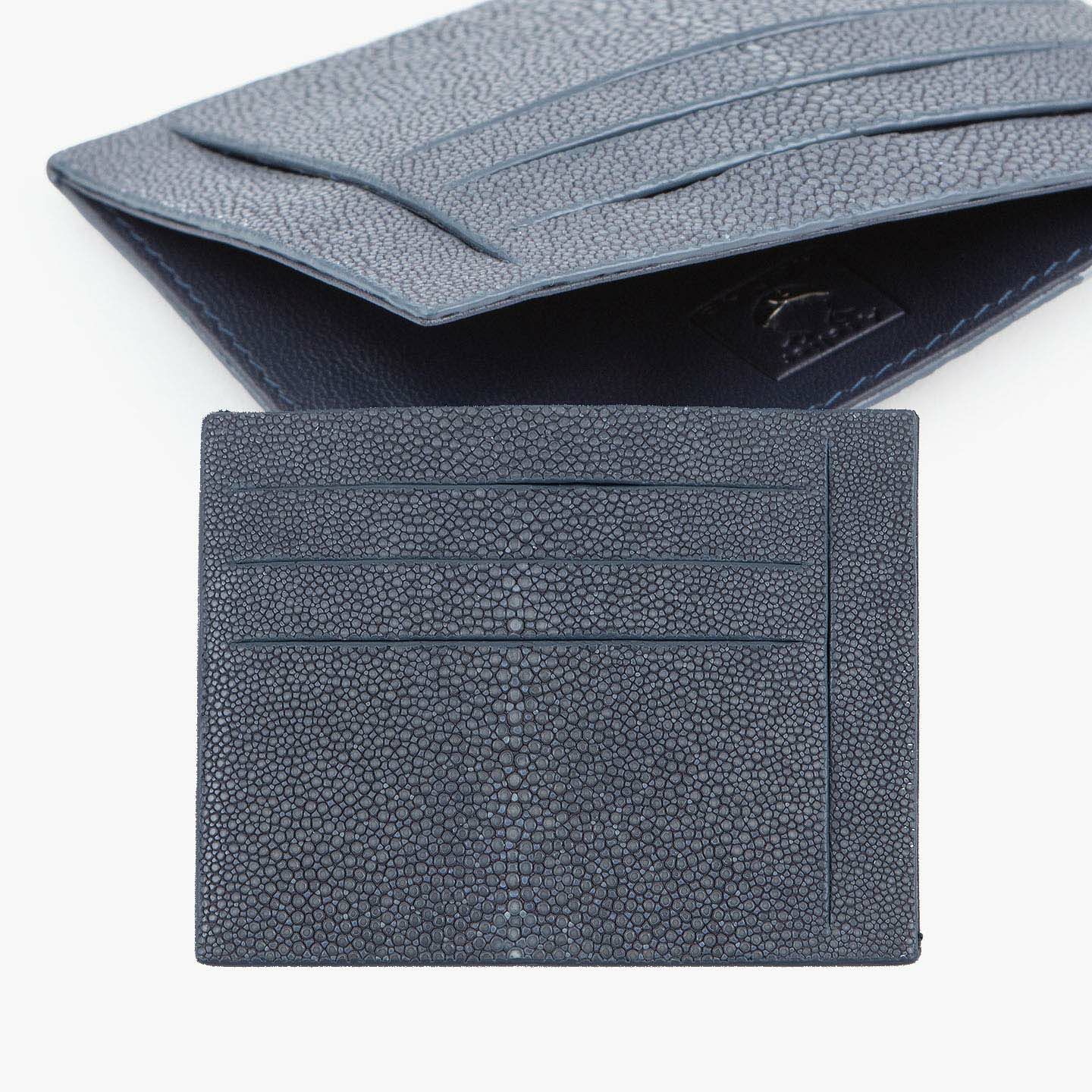 コンセプトに“Cuirs D'ailleurs 〜旅するレザー〜”を掲げ、他の人たちとは違った美学によるクールで洒落た人生の旅へと誘う、ブランド『Atelier AKNAS』のスリット札ばさみ。美しく覆っているガラスビーズを散りばめたような小さな鱗と、地中海の潮風を指先で感じるような冷んやりとした感触が魅力的な「ガルーシャ」を、外装として纏わせ贅沢感を演出。その両サイドに、無縫製の切り込みでフラットに仕立てたカードポケット各3つ(計6つ)・スリット式フリーポケット各1つ(計2つ)を備え、二つ折りの紙幣を簡単に差し込んで10枚ほど収納できる札入れとともに、金具を排したスリム&スマートな使用感をもたらしてくれる。