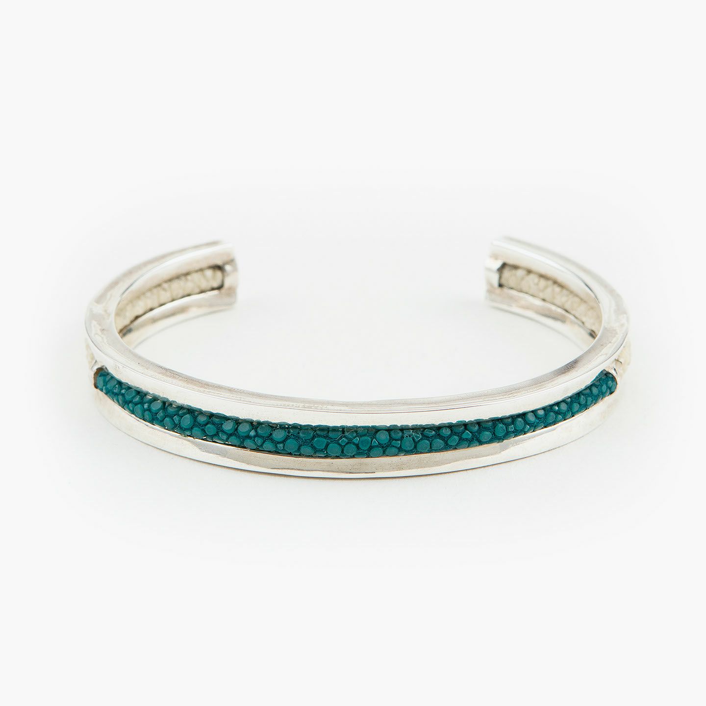 クリエイティビティとクオリティにこだわる革職人たちが、飽くなき探求と努力により最高のパフォーマンスを実現しているブランド『Atelier AKNAS』のバングル“ROHAN”。ガラスビーズを散りばめたようなアカエイの小さな鱗が美しい「ガルーシャ」を、熟練の職人がハンドメイドで丸く曲げた、無垢の「シルバー925」によるフレームの中抜き部分に、曲線に沿わせながら丁寧に組み込み、エレガントな上質感を創出。“海の宝石”と言われる2色のエイ革による重厚感を表現しながら、見た目よりも軽量化させているツヤ肌のメタルフレームが、重さを感じずカジュアルに装着でき、ジュエリーとしての愛着感をさらに高めてくれる。