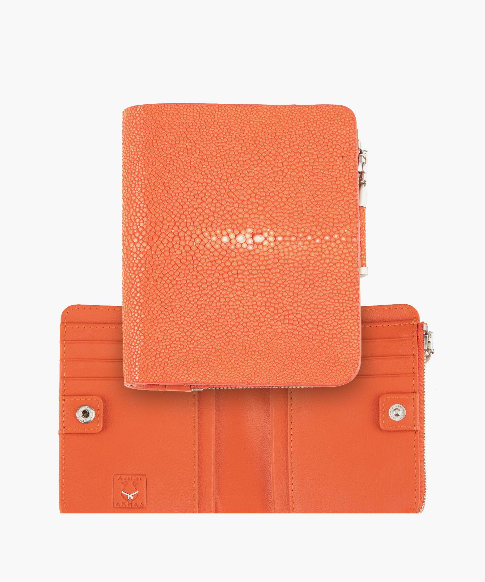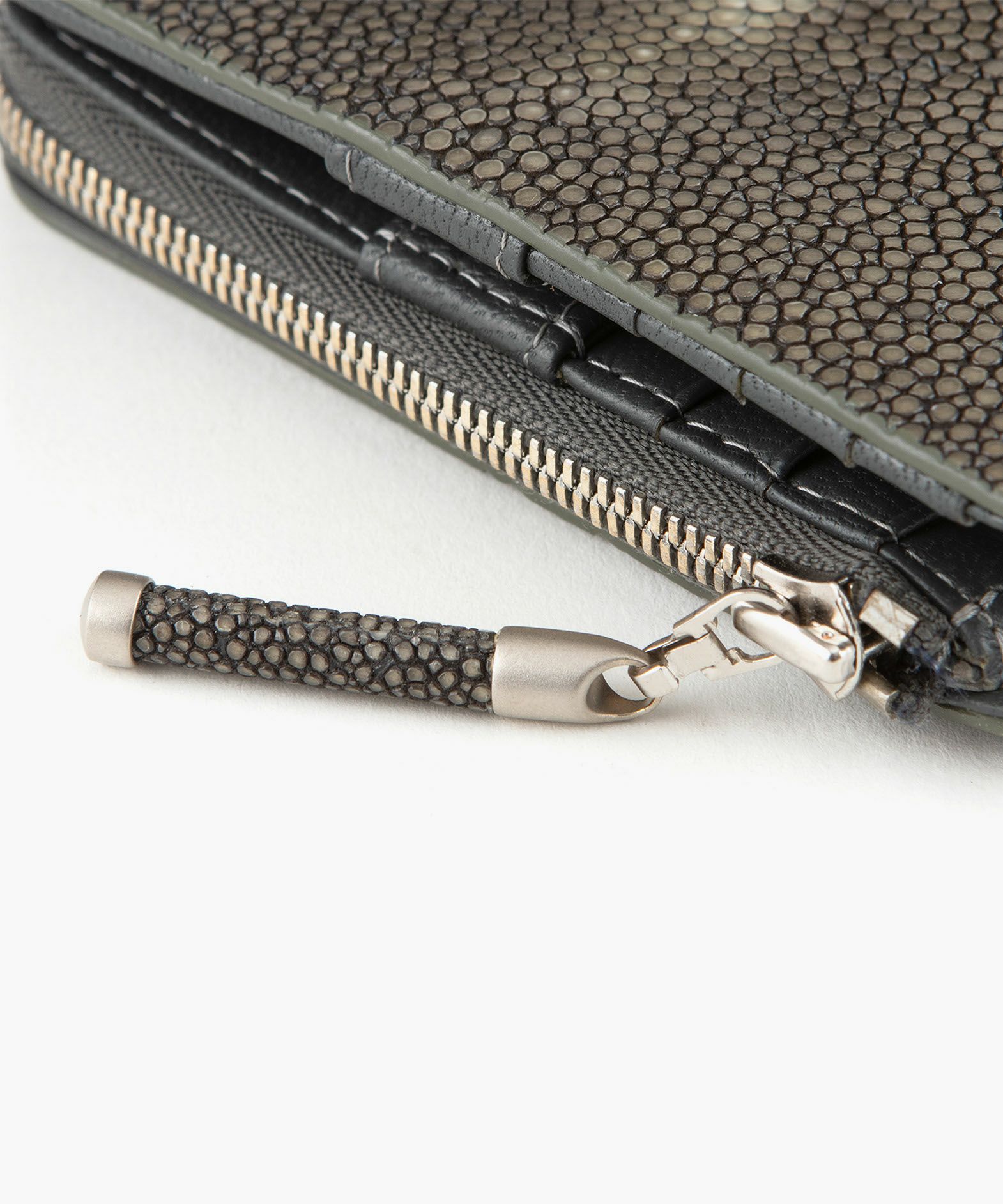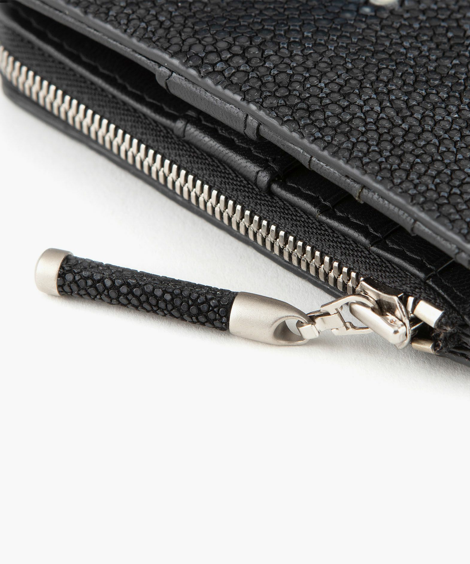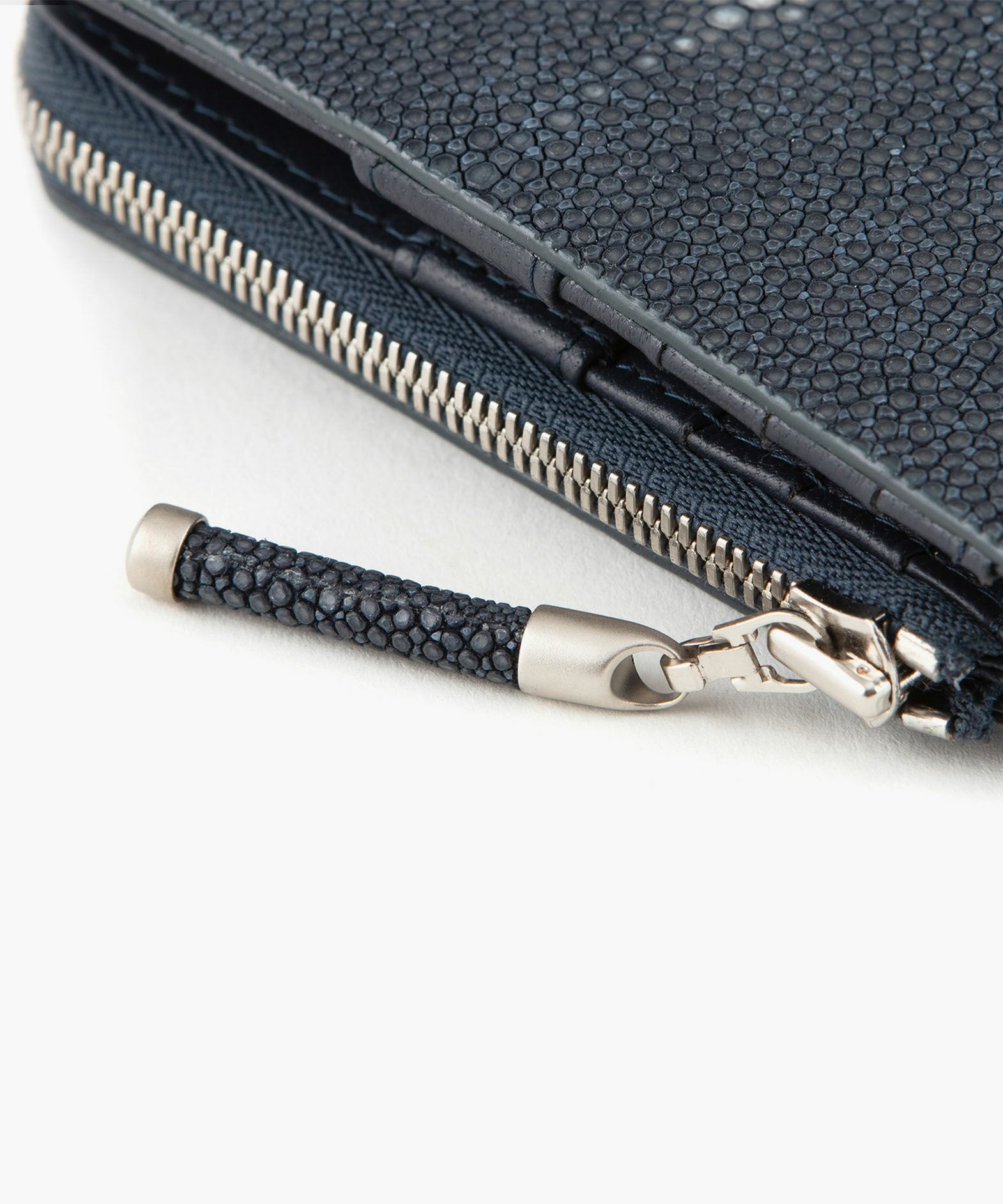 クールで洒落た人生の旅へと誘っていく、“Cuirs D'ailleurs 〜旅するレザー〜”をコンセプトにしている、ブランド『Atelier AKNAS』のミドルウォレット。ジェンダーレスで好まれるラウンドフォルムに、ガラスビーズを散りばめたようなアカエイの小さな鱗が美しい、海の宝石「ガルーシャ」を外装として贅沢に纏わせ、地中海の潮風を指先で感じるような冷んやりとした感触も魅力的。オリジナルの引き手とともにデザインのアクセントにもなっているL字ファスナー式小銭入れのほか、札入れ1つ・フリーポケット4つ・カードポケット6つも備えている充実した収納力で、普段使いにおける機能美へのこだわりも感じさせてくれる。