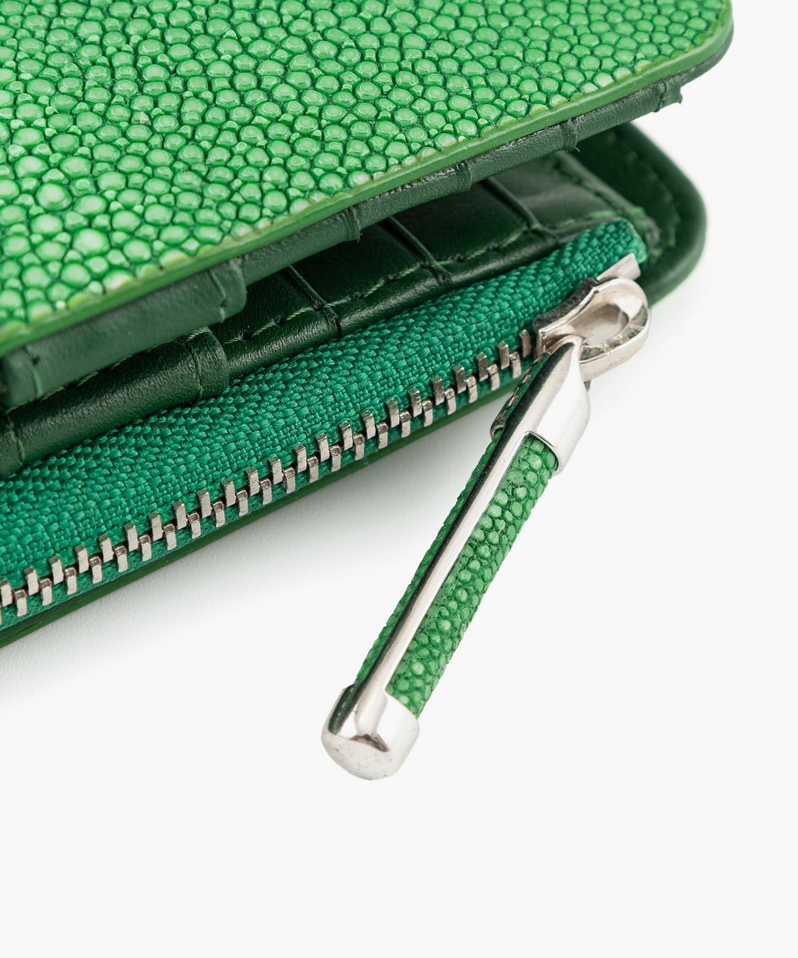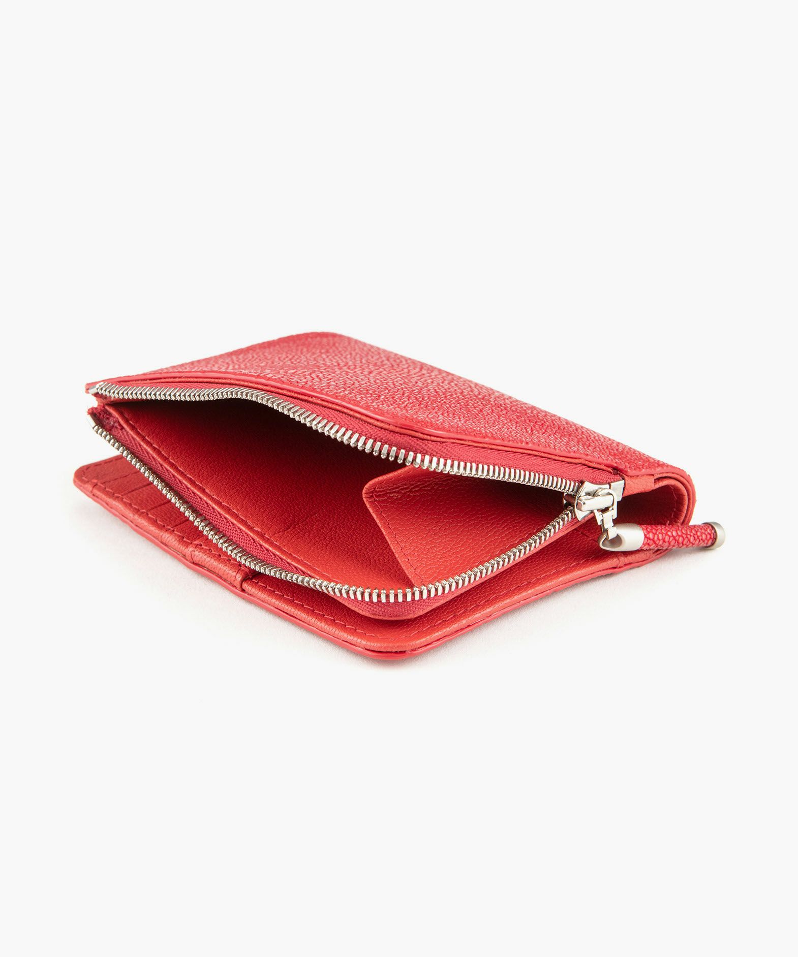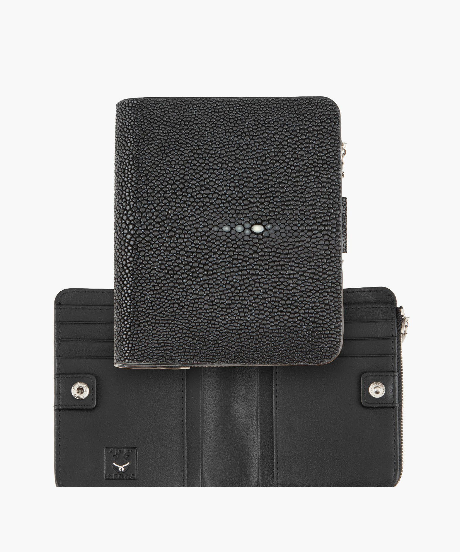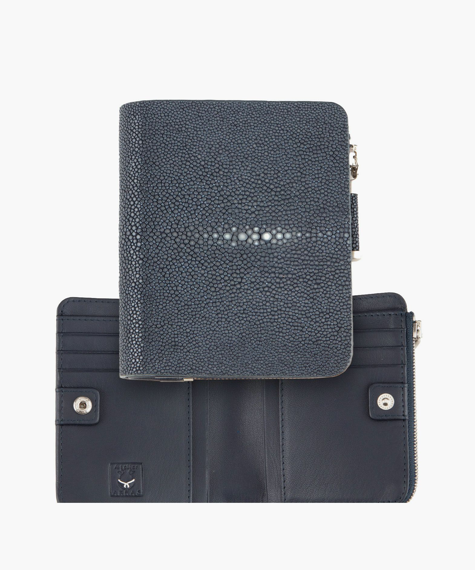 クールで洒落た人生の旅へと誘っていく、“Cuirs D'ailleurs 〜旅するレザー〜”をコンセプトにしている、ブランド『Atelier AKNAS』のミドルウォレット。ジェンダーレスで好まれるラウンドフォルムに、ガラスビーズを散りばめたようなアカエイの小さな鱗が美しい、海の宝石「ガルーシャ」を外装として贅沢に纏わせ、地中海の潮風を指先で感じるような冷んやりとした感触も魅力的。オリジナルの引き手とともにデザインのアクセントにもなっているL字ファスナー式小銭入れのほか、札入れ1つ・フリーポケット4つ・カードポケット6つも備えている充実した収納力で、普段使いにおける機能美へのこだわりも感じさせてくれる。