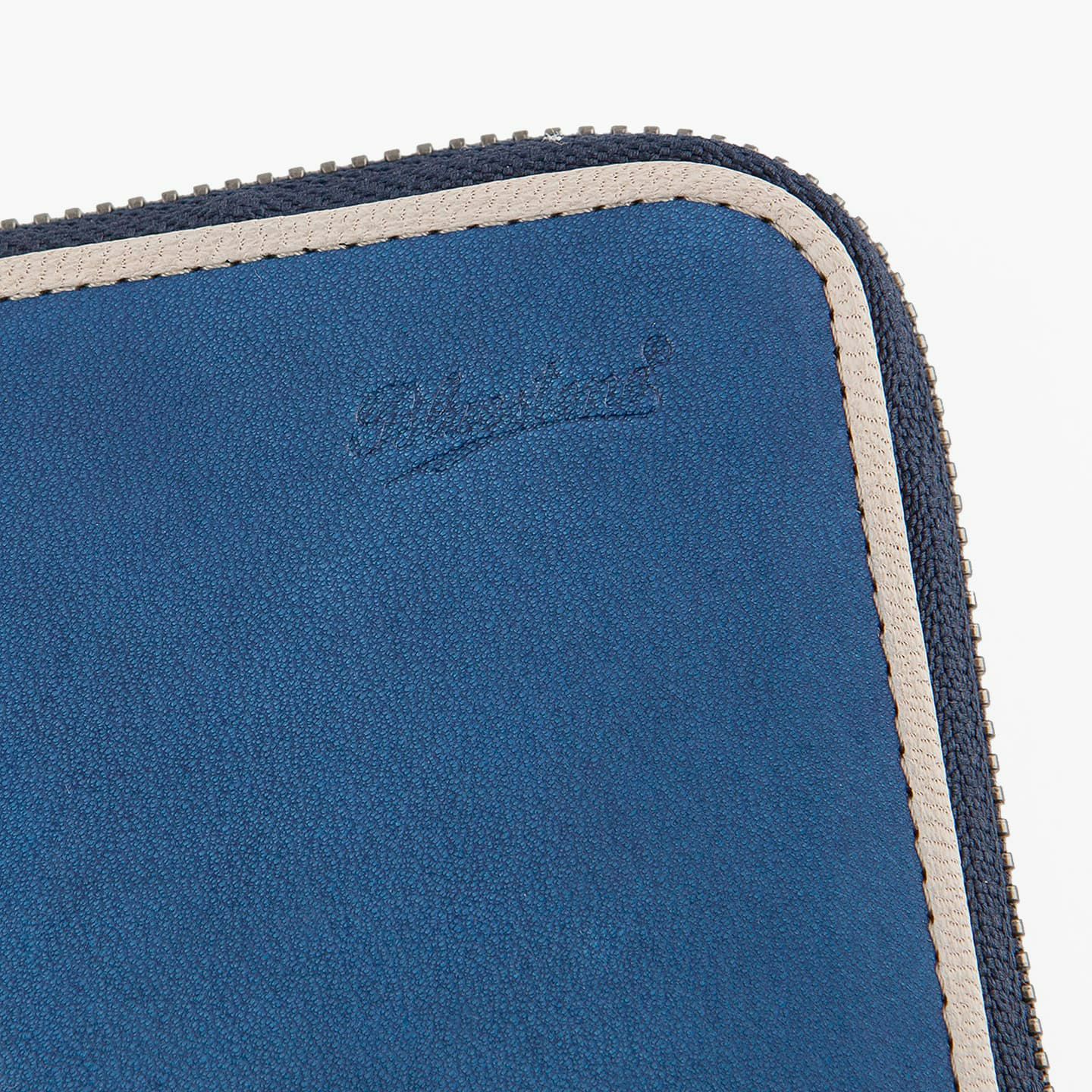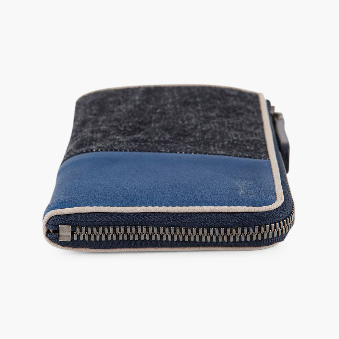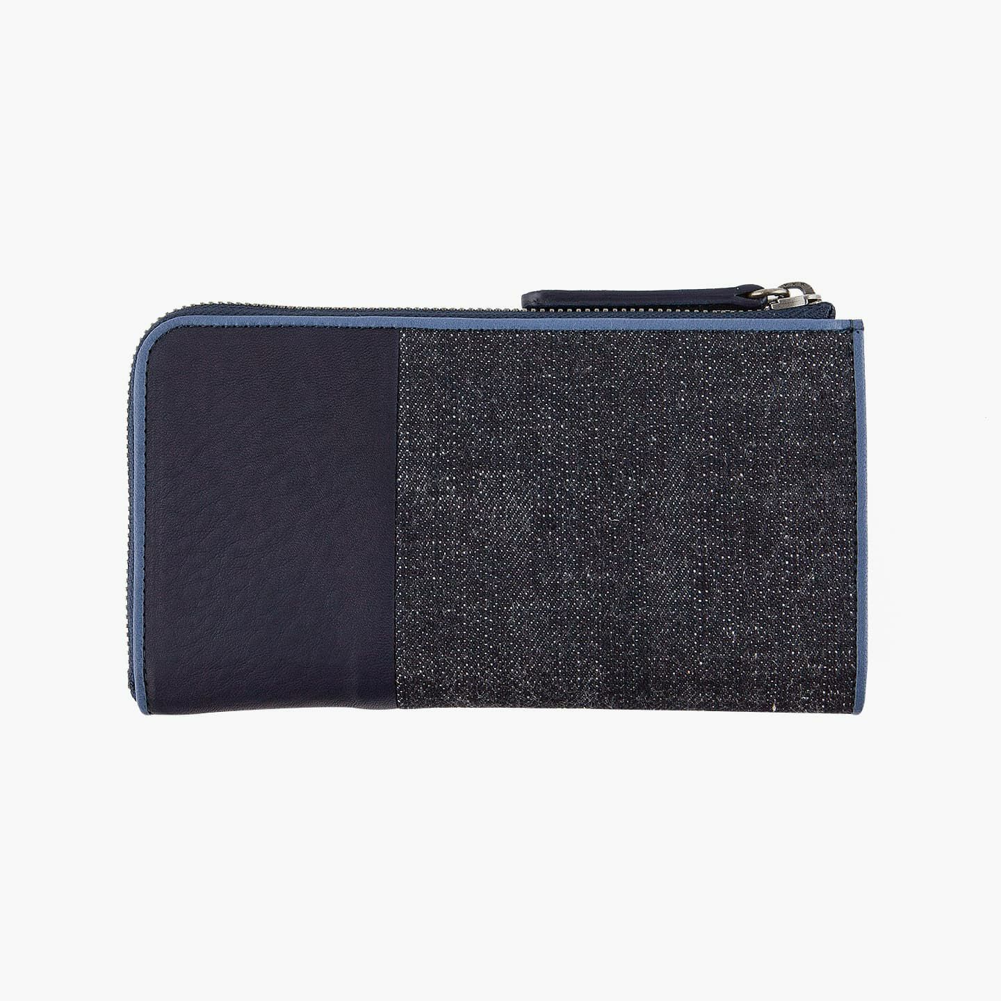 徳島産・天然染料「すくも」で染め上げた天然本藍染革「SUKUMO Leather」が、希少で人気が高い岡山・井原産「セルビッチデニム」を横切るようにレイアウト。ふたつの異なるブルーの競演による美しさとともに、スタイリッシュなL字ジップによる使いやすさも追求。長く使い込むほどに自分らしい表情を醸し出していき、他では得られない愛着感を育んでくれる。