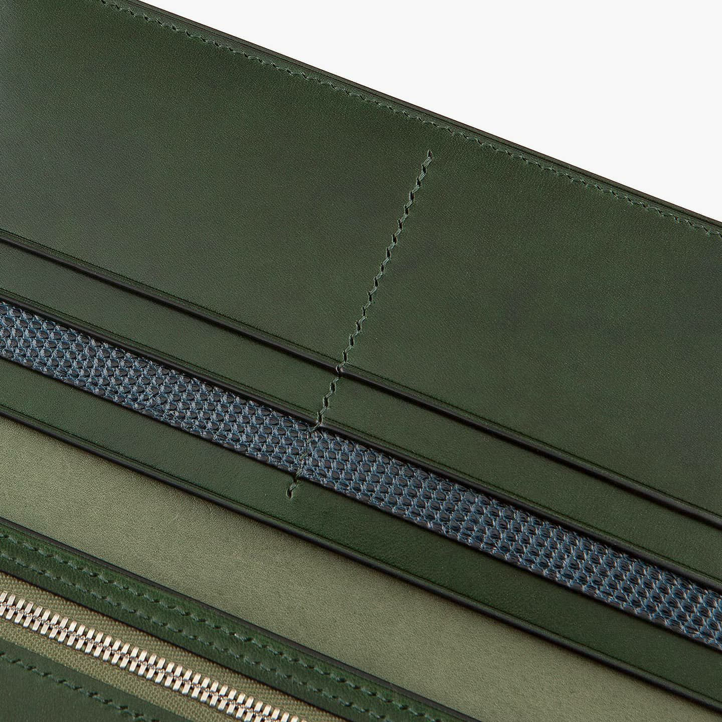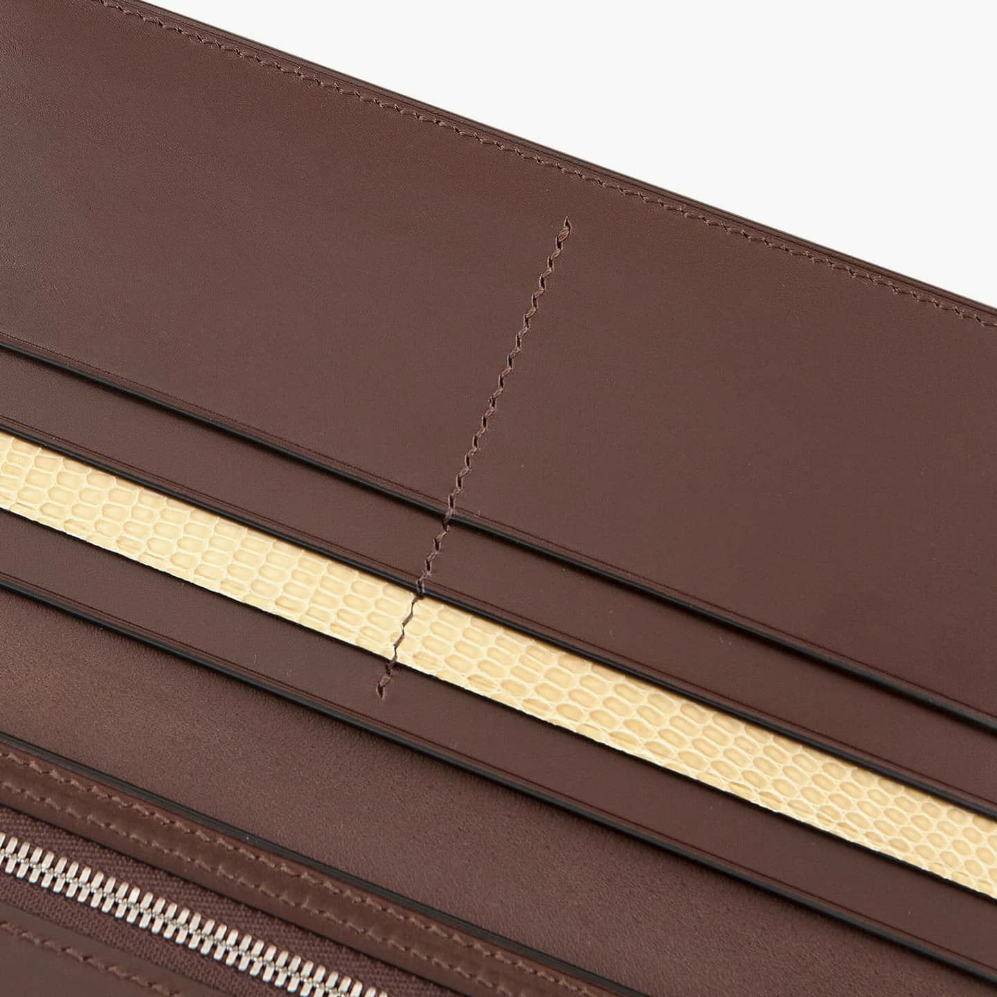 世界中のレザーアイテムに精通した『Mens Leather Store』が、ビスポークで手縫いの革製品を展開してのいるブランド『Crevaleathco』に、選りすぐりの高級素材や優れた実用性、普遍的で美しいデザイン性のすべてを兼ね備えた革製品を特別にオーダーして誕生した小銭入れ付き長財布。『Crevaleathco』の革職人・西森による匠の技を駆使し、細部に至るまで緻密で丁寧な総手縫いで一点一点仕上げています。外装の全面にエレガントな表情の「ブリランテ」を貼り合わせ、内装のカードポケットにワンポイントとして「リザード」をレイアウト。落ち着きのある洗練された佇まいと、個性的な組み合わせによる魅力が、毎日に使う歓びをもたらしてくれます。