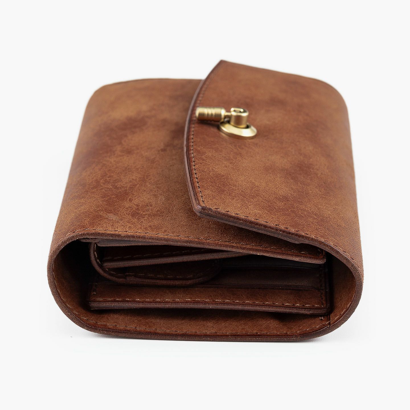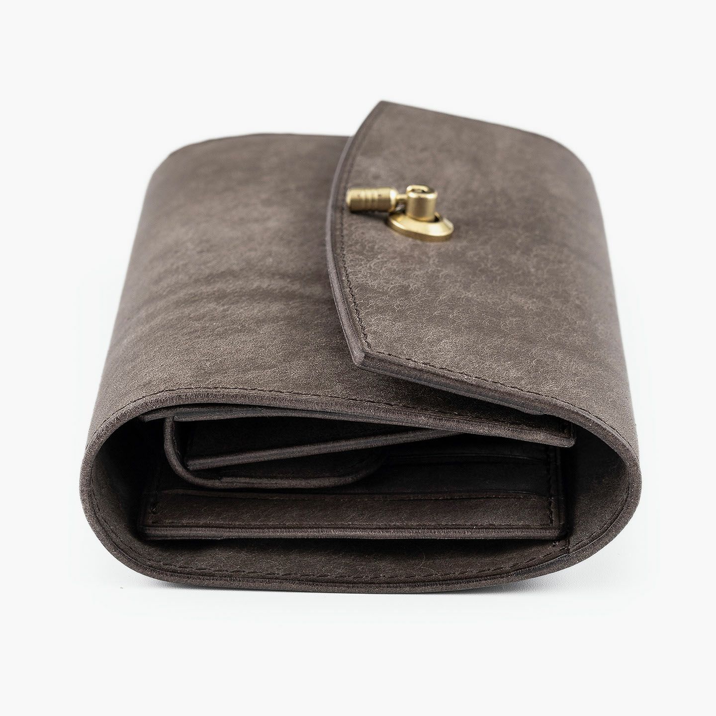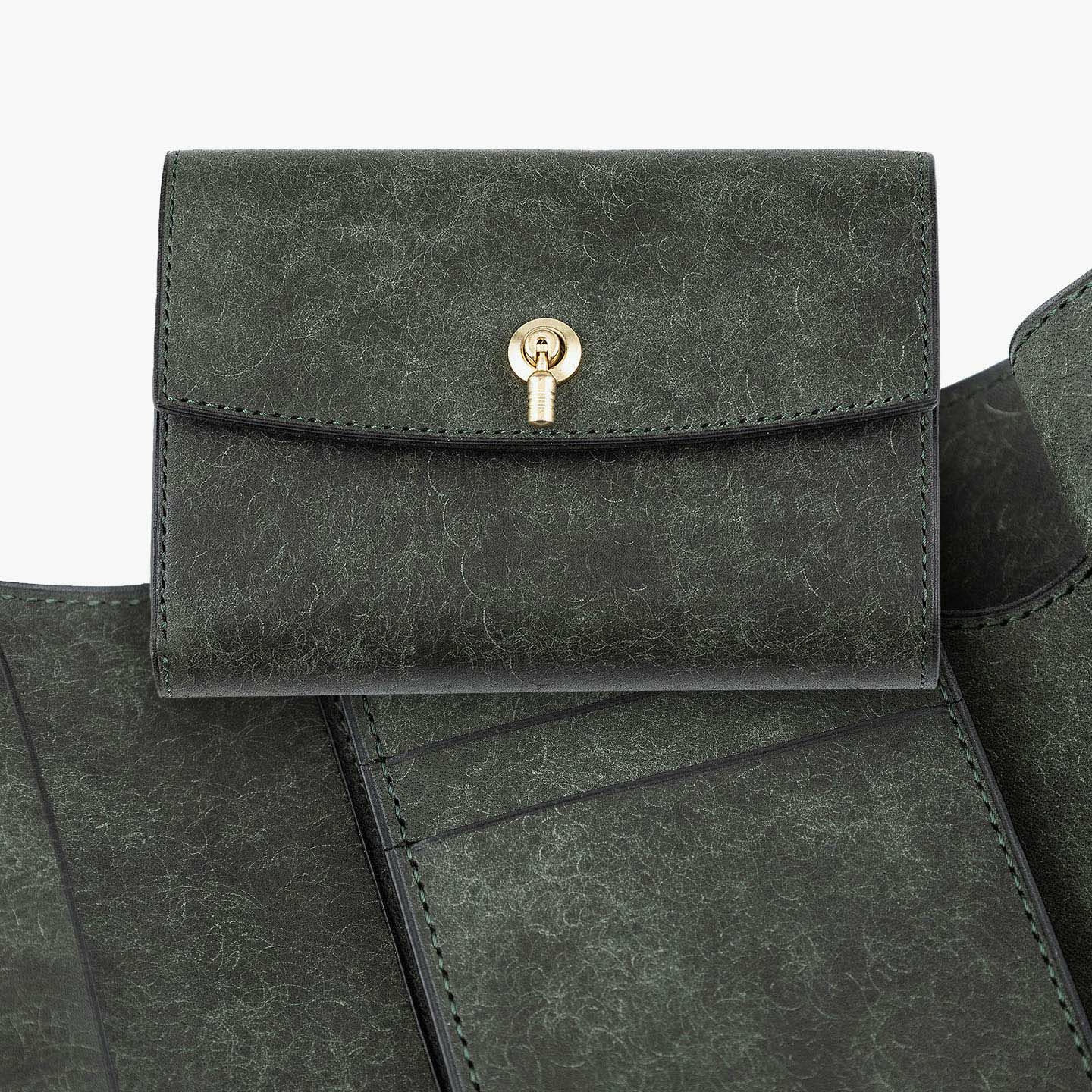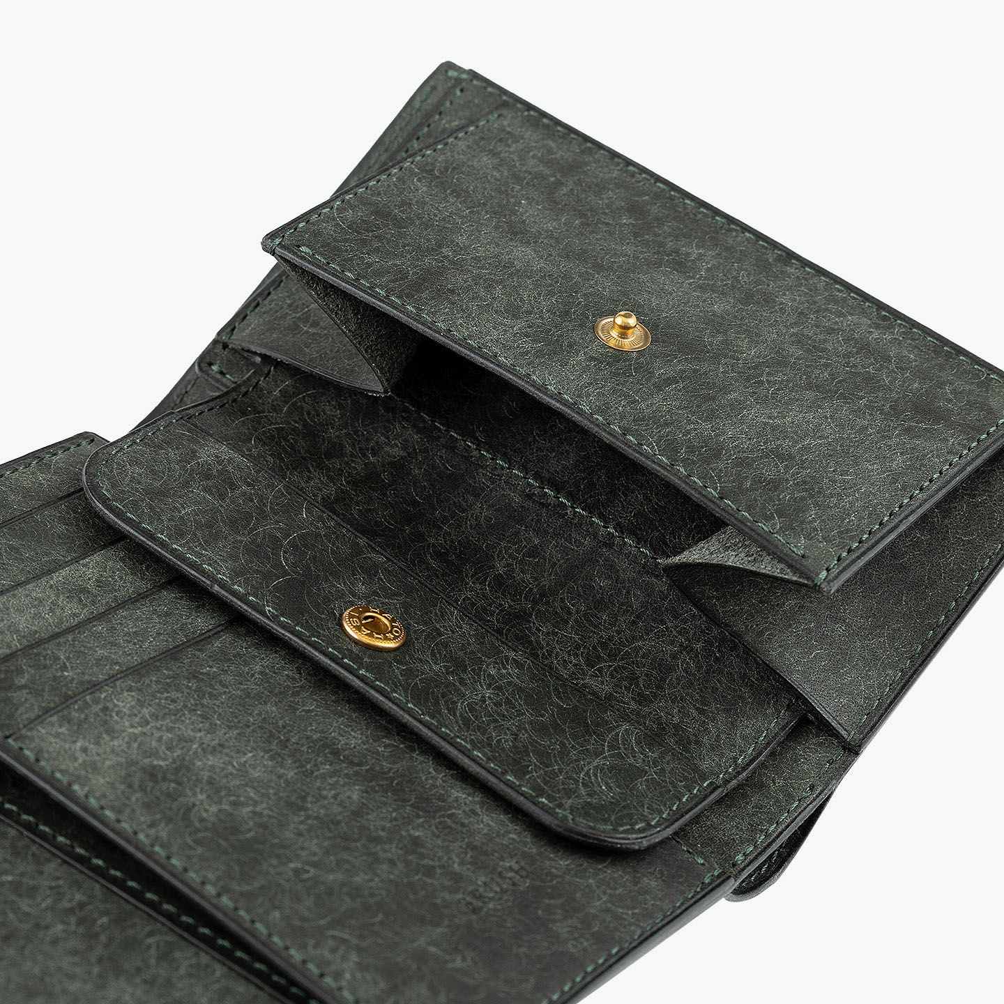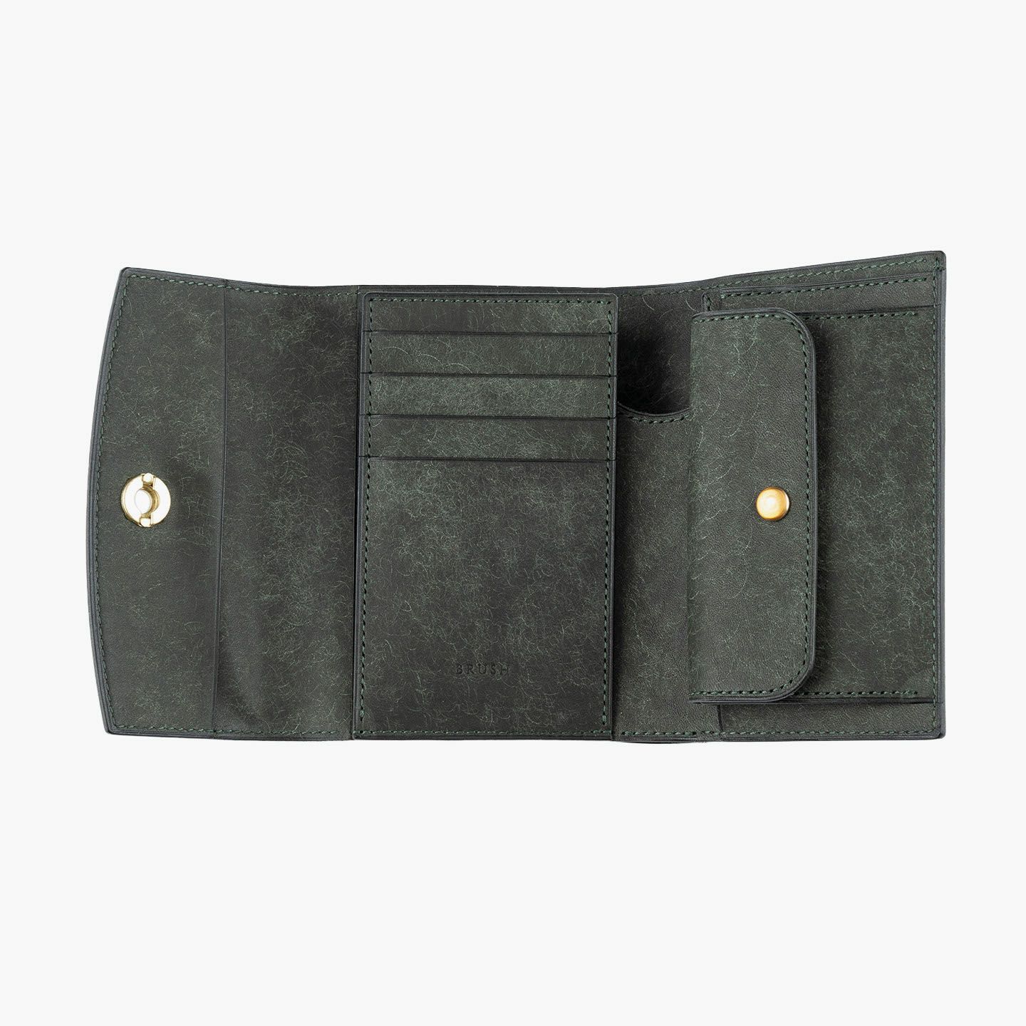 日本の工場にて真鍮の塊を削り出して成型しているフロントのオコシ金具は、丈夫で壊れにくく開閉時の重圧感・本物感も醸し出す挽物。イタリア産レザー「マルゴー」は、MLS別注カラー「Moss Green」とブランドラインナップ3色による、計4色からのセレクトオーダーが可能です。片側をあえて縫い付けていない札ばさみは、大きく開く視認性の良さに加えて、親指を掛けられるU字の窪みを設けることで扱いやすく、窪みの深さも女性の手のサイズに合わせた設計になっているのも魅力。さらに、収納性に優れたコインポケットとともに、カードポケット4つを備えたカード段、そのカード段の裏とコインポケットの裏にフリーポケット1つずつを装備し、充実した収納力も兼ね備えています。