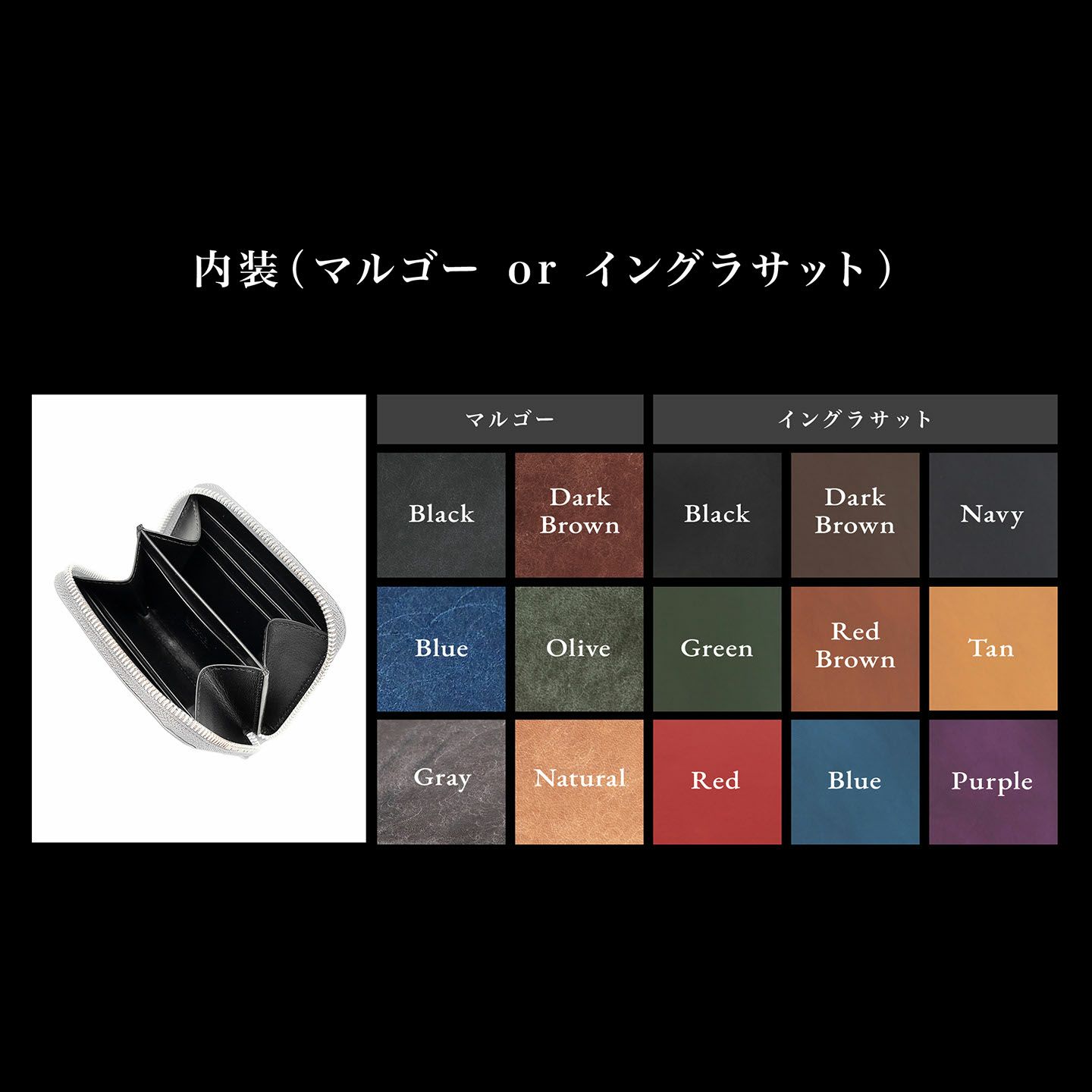 センターで仕切られた両サイドのマチが大きく開いて使いやすく、そのマチにより設けられた2つのフリースペースに、紙幣(二つ折り)・小銭・レシートや計5つのカードポケットに収まり切らなかったカードなどをマルチに収納できる設計。センター仕切りの片側にはカードポケット1つを装備し、頻繁に使うカードの収納などに便利です。さらに、「マルゴー」6色・「イングラサット」9色から、外装と内装の素材・カラーを自分の好みで自由に組み合わせられ、日本の革小物の伝統技法「切り目磨き」のコバは、カラーオーダーの組み合わせによりブラックもしくは最適な色をブランドがチョイス。ハイクオリティな総手縫いでクラフト感あふれる糸色も、高級麻糸「MeiSi Superfine Linen Thread」の多彩な25色からセレクトできます。また、外装カラーと統一されたファスナーテープの色を考慮しながら、ファスナーもSilver・Goldのいずれかから選ぶことが可能。豊富なバリエーションから素材・カラーをセレクトして、オーダーメイドのように受注生産できるので、一品もののような満足感も得られます。