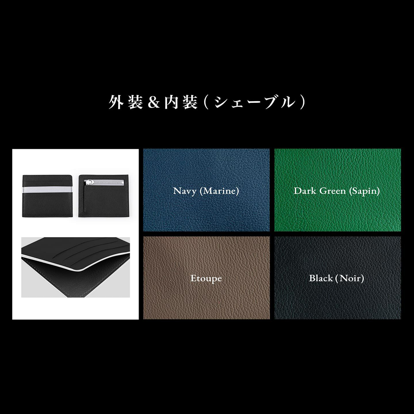 表面のカードポケットには、装飾の「マルゴー」を1段あしらいながら、スリムさを維持するために、カードを3枚収納しても厚くならないように設計。背面の小銭入れは、小さなマチで薄さを保ちながらも、小銭を出し入れしやすくするために最大限に開く仕様。外装の同じカラーで調和しているファスナーテープと、YKKエクセラのシルバーを採用している金具が、細部の美しさを引き立てています。