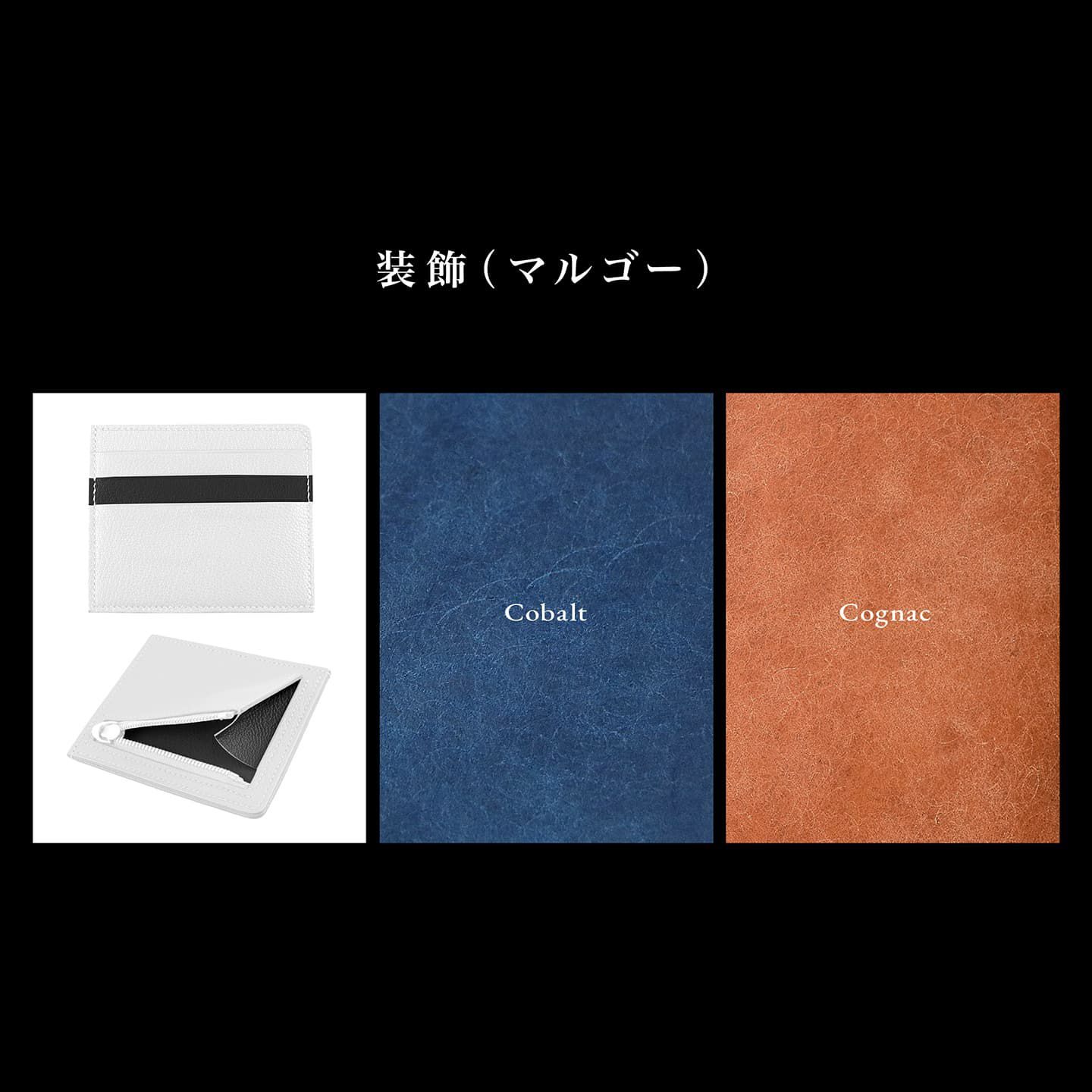 外装と札ばさみ裏地に、山羊革「シェーブル」を採用することで、美麗なシボが魅力的な高級感と、紙幣の収納がしやすい使用感を両立。外装装飾と小銭入れ内部・マチには、デザインのアクセントにもなる和紙のような質感の「マルゴー」を採用し、一部でありながらもツヤ感が増していくエイジングを楽しめます。「シェーブル」は4色から、「マルゴー」は2色から選んで、好みのカラーを組み合わせてオーダーできる受注生産。2種類の素材は、強度が保てるように薄過ぎない厚さで、軽過ぎない存在感に仕上げています。