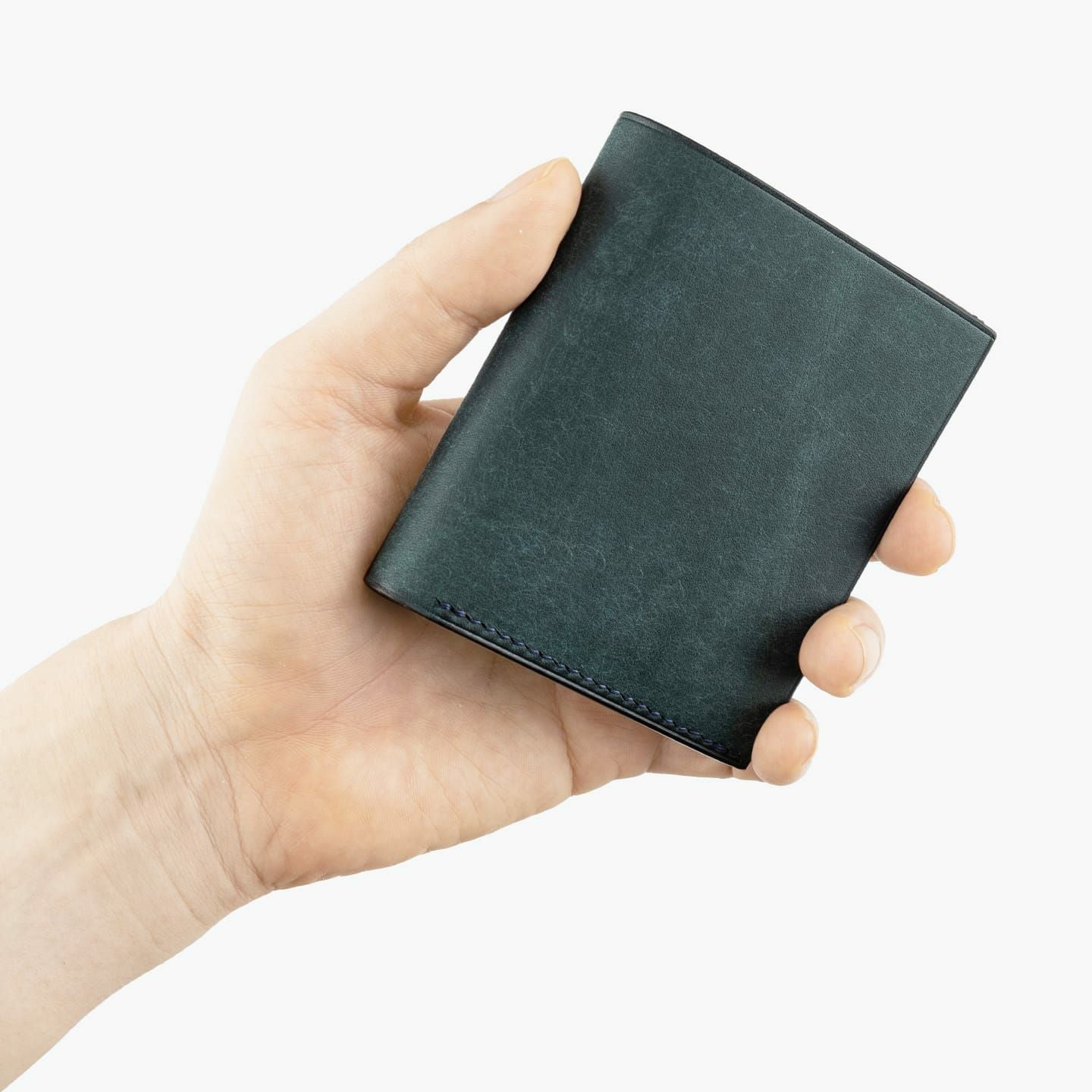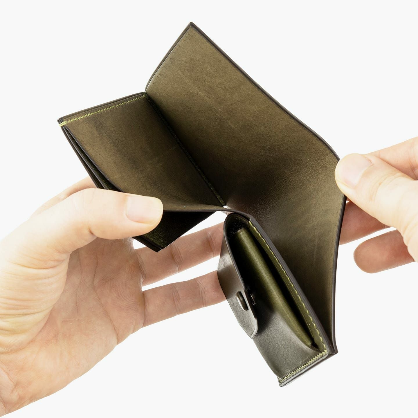 すべて革素材のみで、ナイロン・布・紙などを一切使わない贅沢な仕様のため、手に収まるコンパクトサイズにも関わらず、使い始めは厚みを感じてしまいながらも、使い込むうちに柔らかさが生まれて薄くなっていき、スリムな使い心地へと次第に変化。内装の左サイドに備えたカードポケット3つは、角を落とした特長的なデザイン性と、軽く斜めからの出し入れができて、効果的なステッチにより抜け落ちづらい機能性も両立しています。また、右サイドに設けた小銭入れは、大きく開いて十分な収納性があり、その裏にはマルチポケット1つを装備。さらに、片側の縫製をなくして開口が大きな札入れは、紙幣の出し入れしやすさとともに、二つ折りを閉じて密閉させることで紙幣が抜け落ちないようにしっかりホールドします。