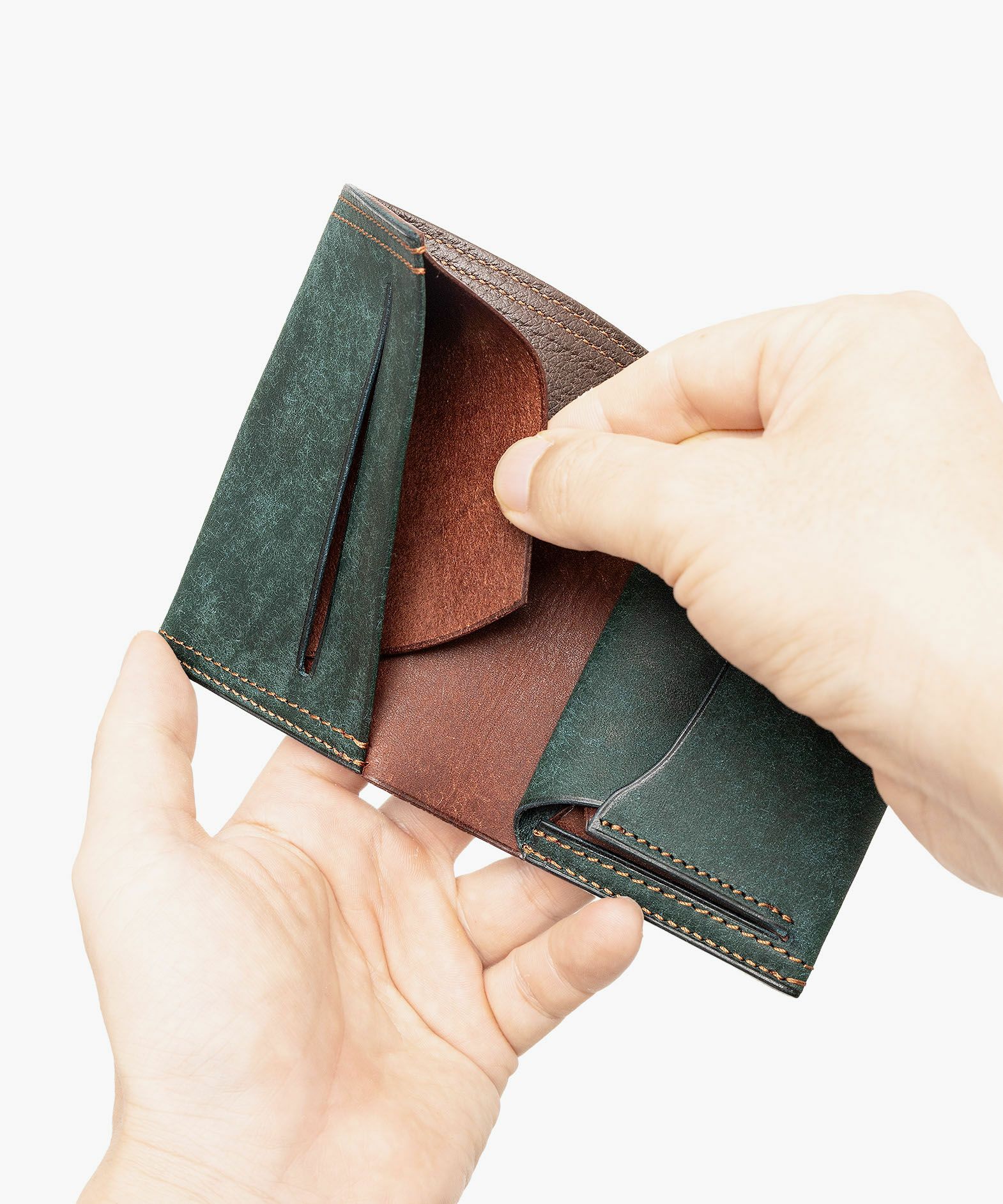 心と心を繋ぎ止められるような革製品を作り出していくために、革職人・栗本麻央が全工程をひとりで手作業により製作している、レザーブランド『Cobalt Leather Works』のハーフウォレット。和紙のような風合いから美しいツヤ肌へと経年変化していく「プエブロ」を、名称の如く“Kururi”(くるり)と包むように両サイドを折り込んだ独創的なデザインが、丸みを帯びた端部分と手のひらに収まるサイズ感とともに、いつまでも握っていたくなる心地よさを創出。独自設計による内装も特長的で、装飾・収納の配置にこだわった洒落感と、視認性・収納性にこだわった使用感が、一般的な二つ折りよりもコンパクトなサイズ感を実現しながら、唯一無二の魅力を奏でてくれる。