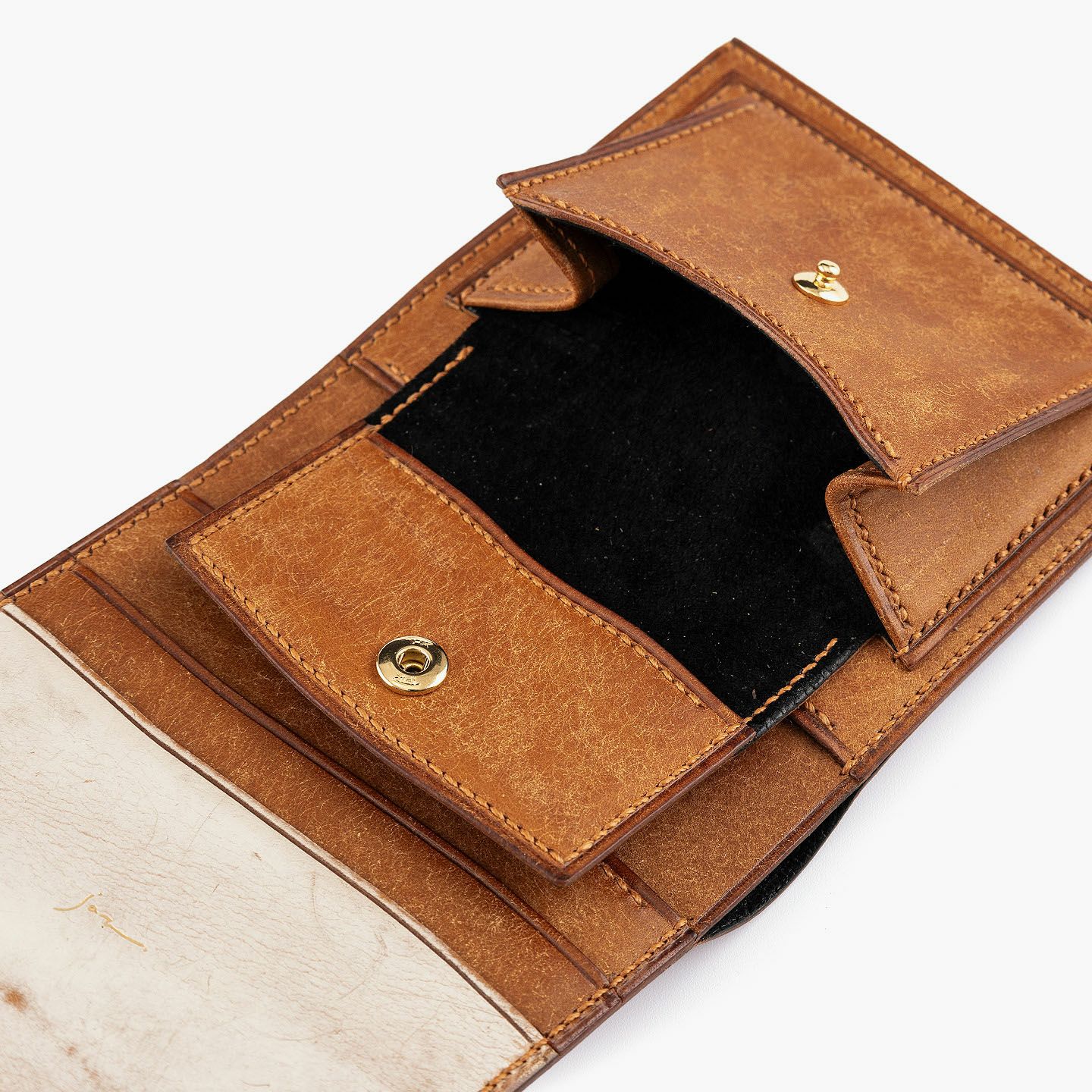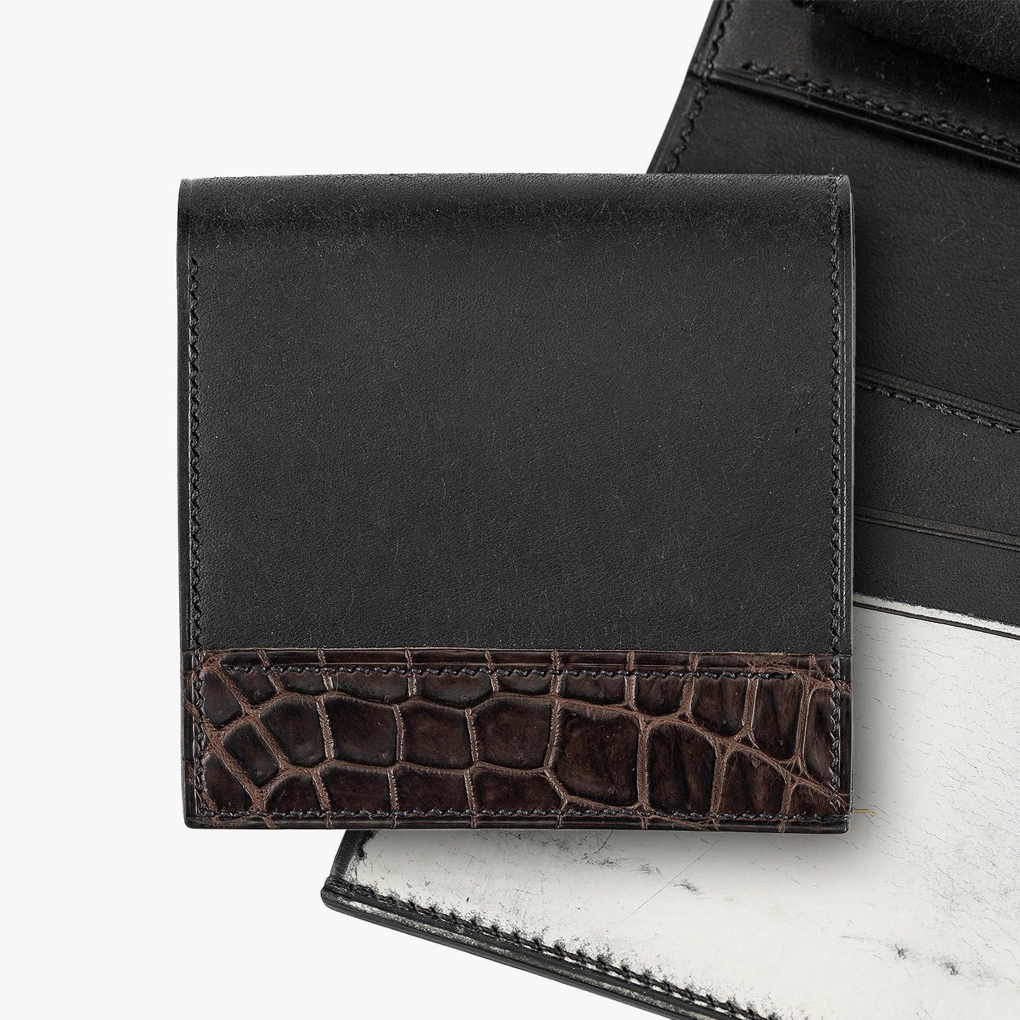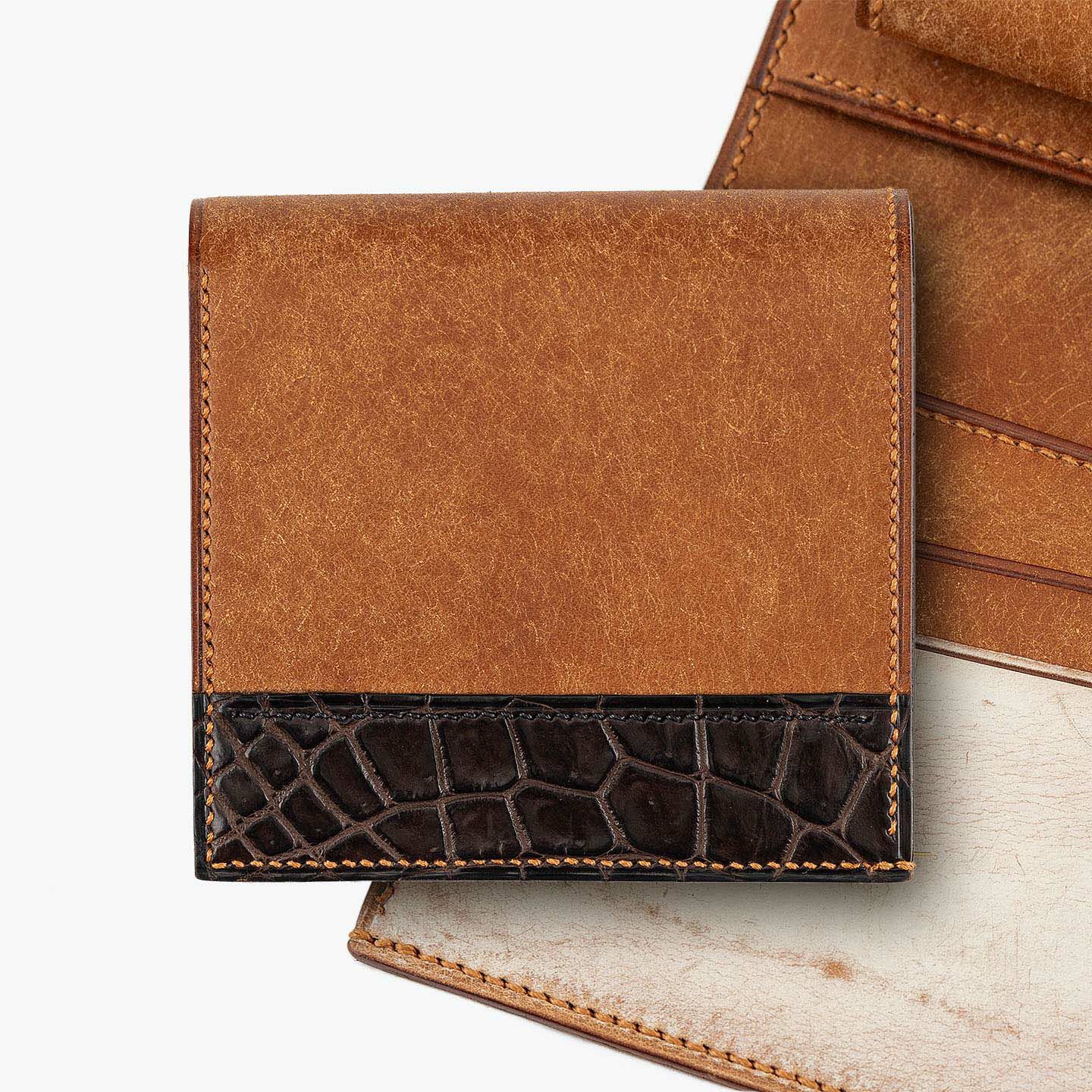外装のアクセントとして高級エキゾチックレザー「クロコダイル」を纏わせ、コンパクトなサイズ感ながら存在感を漂わせている、二つ折り財布(小銭入れ付き)“ワイスホルン 1.1”。その腑模様とは相反する外装・内装の「プエブロ」は、和紙のように表面を起毛させた独特の風合いを醸しながら、ビンテージ感あふれる美しいツヤ肌へと経年変化していく楽しみも。曲線を施したカードポケットのカットラインが、見た目のデザイン性と出し入れしやすい機能性を両立。そのカードユニットの最下段には、内装のアクセントとしてホワイトワックス仕上げを施した「ブーロ」を採用。使い込むほどに内装と同系色の色味が露出していき、「プエブロ」とは異なるエイジングへ。外装・内装それぞれ異なるアクセントが、独創的な感性を演出してくれる。