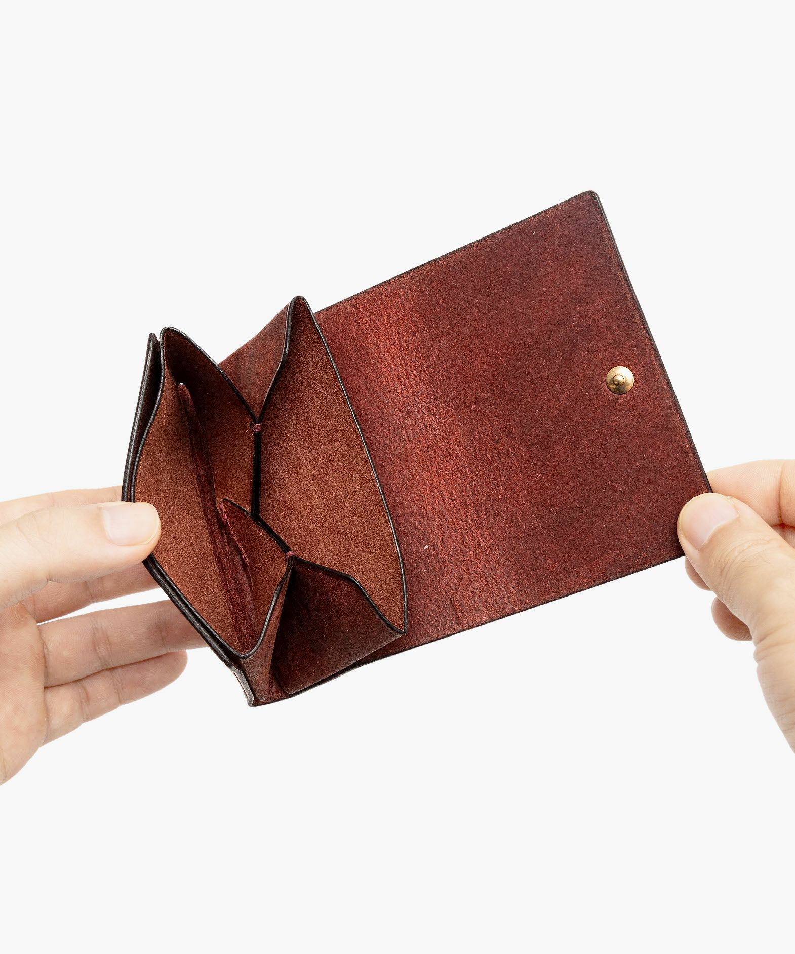 外装カブセの一枚革と最小限のステッチで、内装のメインカードポケット2つ・サブカードポケット2つを“くるむ”ように設計された、名刺入れ“krum2”。イタリアンレザーで人気の高いバダラッシカルロ社による、表面を起毛させた和紙のような風合いの「プエブロ」7色と、滑らかで肌触りが良く透明感のある「リスシオ」3色の、2種類の素材&計10色のカラーからセレクトできるのも魅力で、いずれも味わい深いエイジングへ。革とともに育つ真鍮製の留め具は、ギボシか無しかをチョイスでき、オプションでイタリーホックをセレクトする場合には、ホックの位置を中央・左端・右端から選べる仕様。ギフトなどにもオススメな洒落感あふれる独創的なデザインが、新たな個性と感性をビジネスシーンで輝かせてくれる。