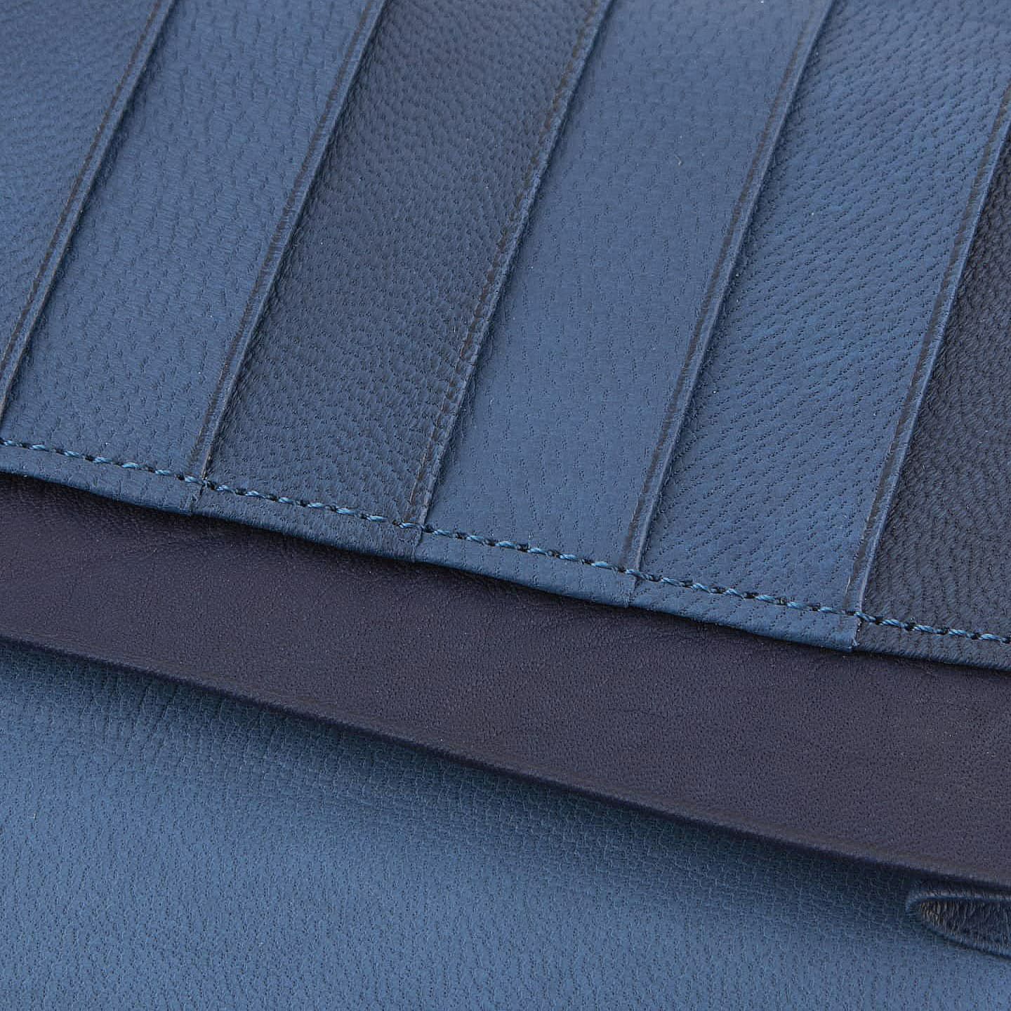 財布の内外ともに素材感があり、デザインの統一性も重視するため、あえてヌバックゴート革の銀面ではない裏面を使用。エイジングにより、手の脂などが染み込み、使うごとに自然なツヤが楽しめます。山羊革自体は、個性的な凹凸をしたシボと、独特な毛穴の形状が特長。薄くても丈夫で、型崩れしにくい特性があるため、高級レザー手袋やブランドのレザーシューズに使われることが多い素材です。また、しなやかで耐久性にも優れているので、身に付けるものやジャケットなどにも多く利用。アメリカ空軍がA-10フライトフローブ、アメリカ海軍がフライトジャケット(M-422)に使っていたことでも知られています。