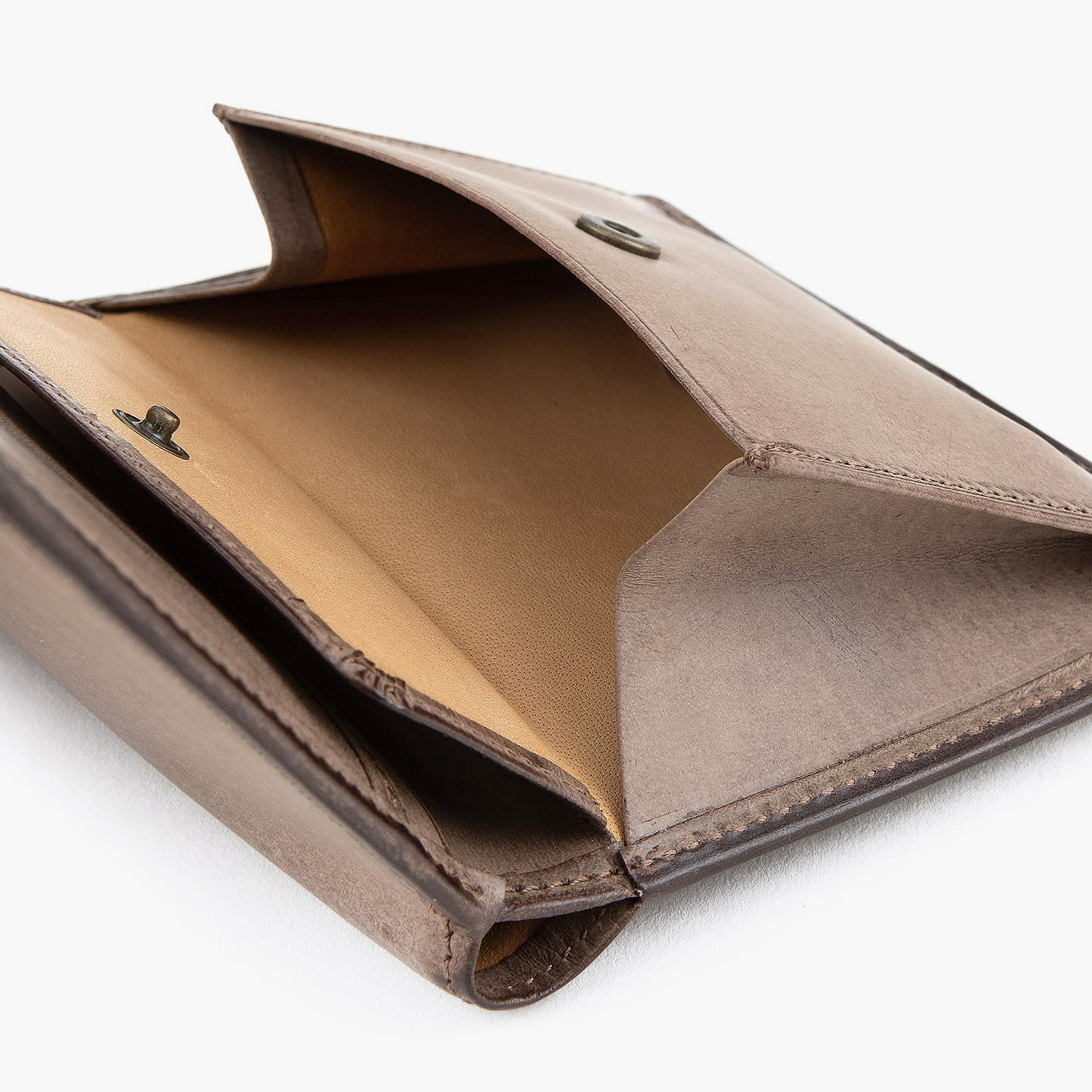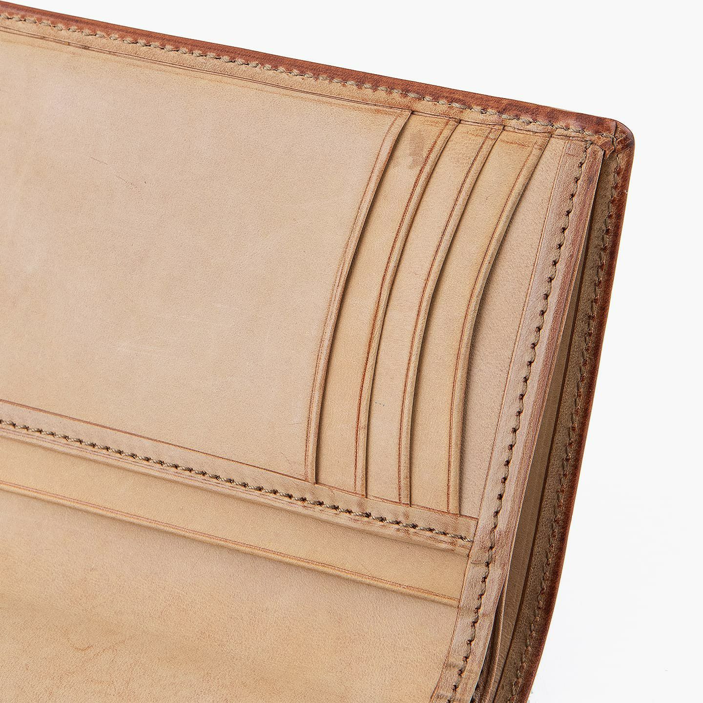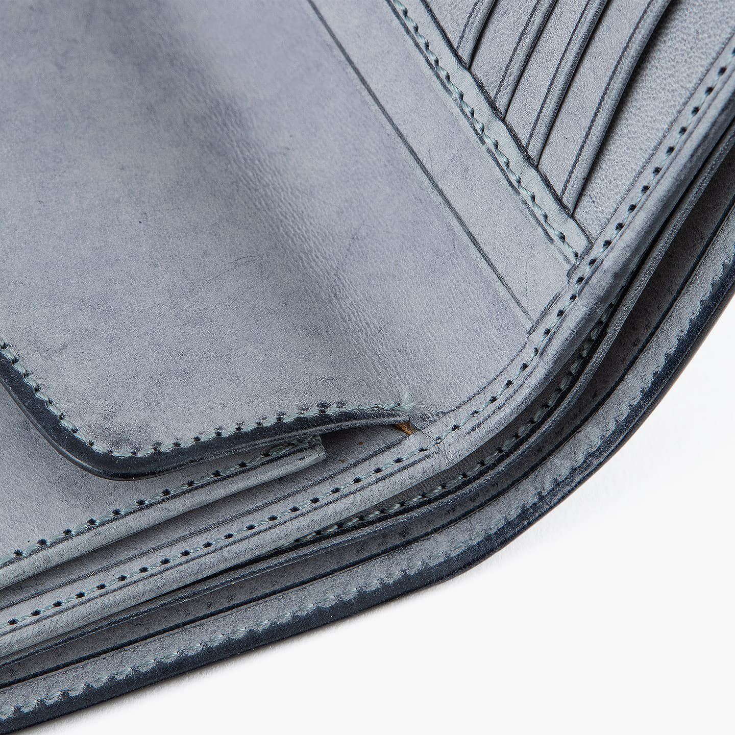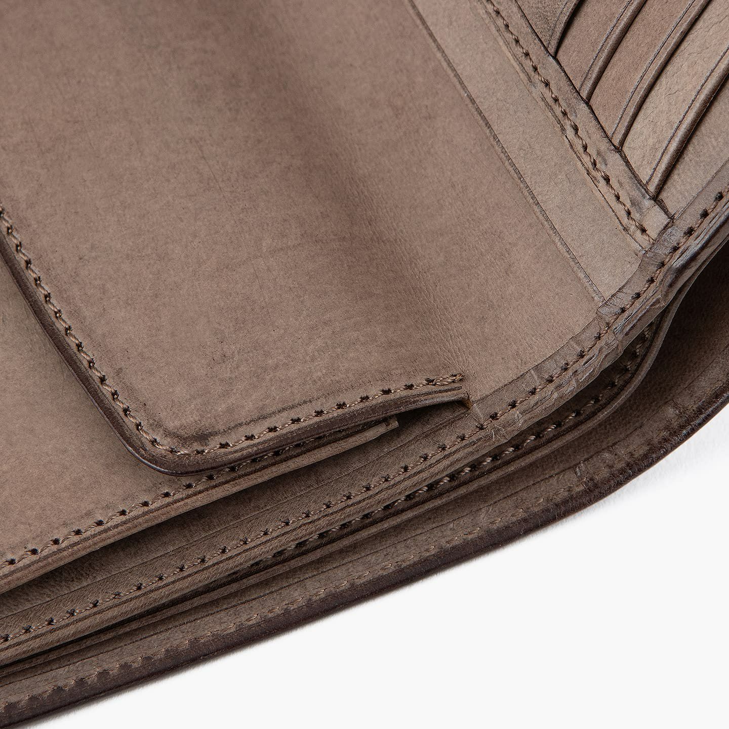イタリア・トスカーナ地方サンタクローチェ地区のタンナー、イタルペル社製の「トゥクソン・ワックス」。繊維密度が高く丈夫なダブルショルダー(成牛の肩部)を用い、伝統的なバケッタ製法で作られたフルベジタブルタンニン鞣し牛革の表皮に、時間をかけてパラフィンワックスを垂らしながら仕上げています。バームクーヘンの作り方のように、ロールにして回しながら上からワックスを滴下していく技法で、回転させる加減により常温時に白くなるワックスが白い濃淡が生まれて、個性的な表情を創出。使用前の淡白い風合いと、使い込んで革色の浮き出てきた風合いが、劇的に変化する個性的な素材で、ワックスが革の内部に溶け込んで、革だけでは表現できない独特なツヤが魅力です。また、ダブルショルダーは首に近い部位でもあるので、“トラ目”と呼ばれる原皮のシワも味として残ることがあり、アイテムとして新たな楽しみ方も見つけられます。