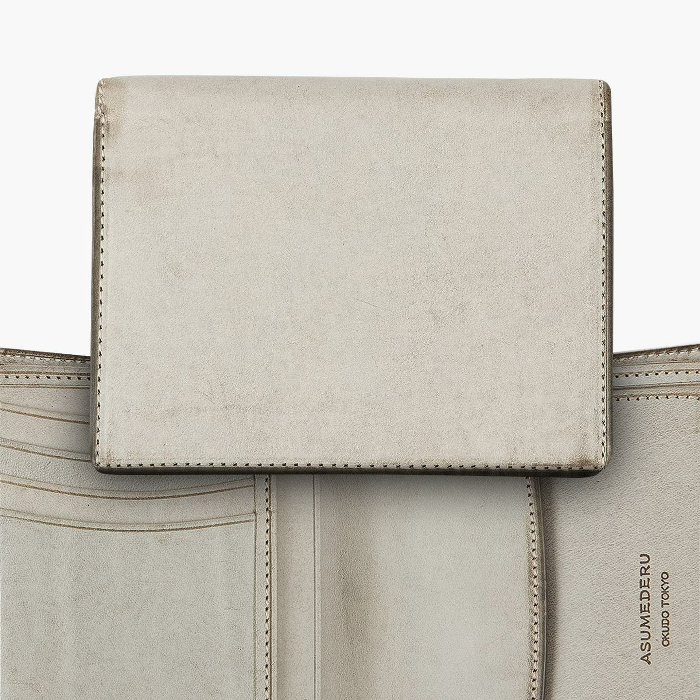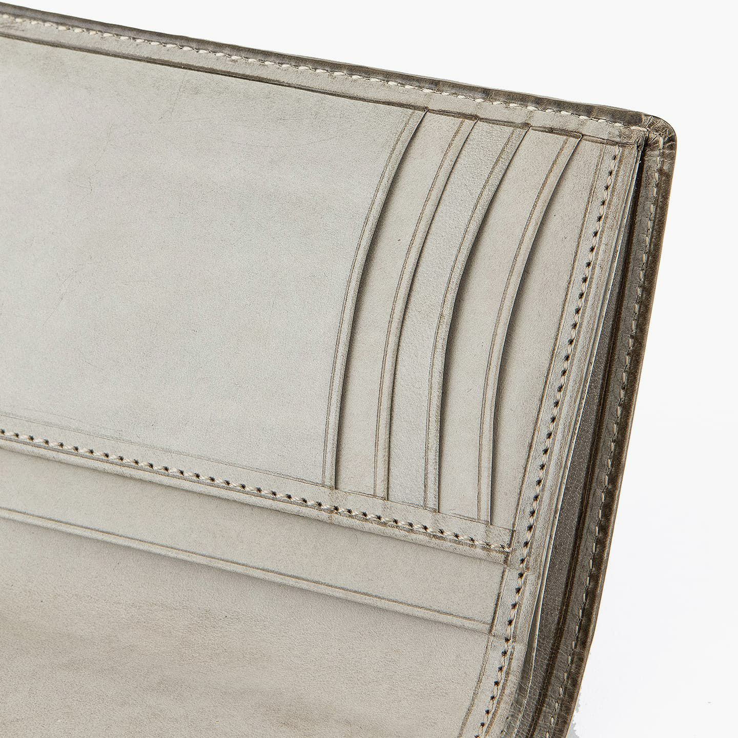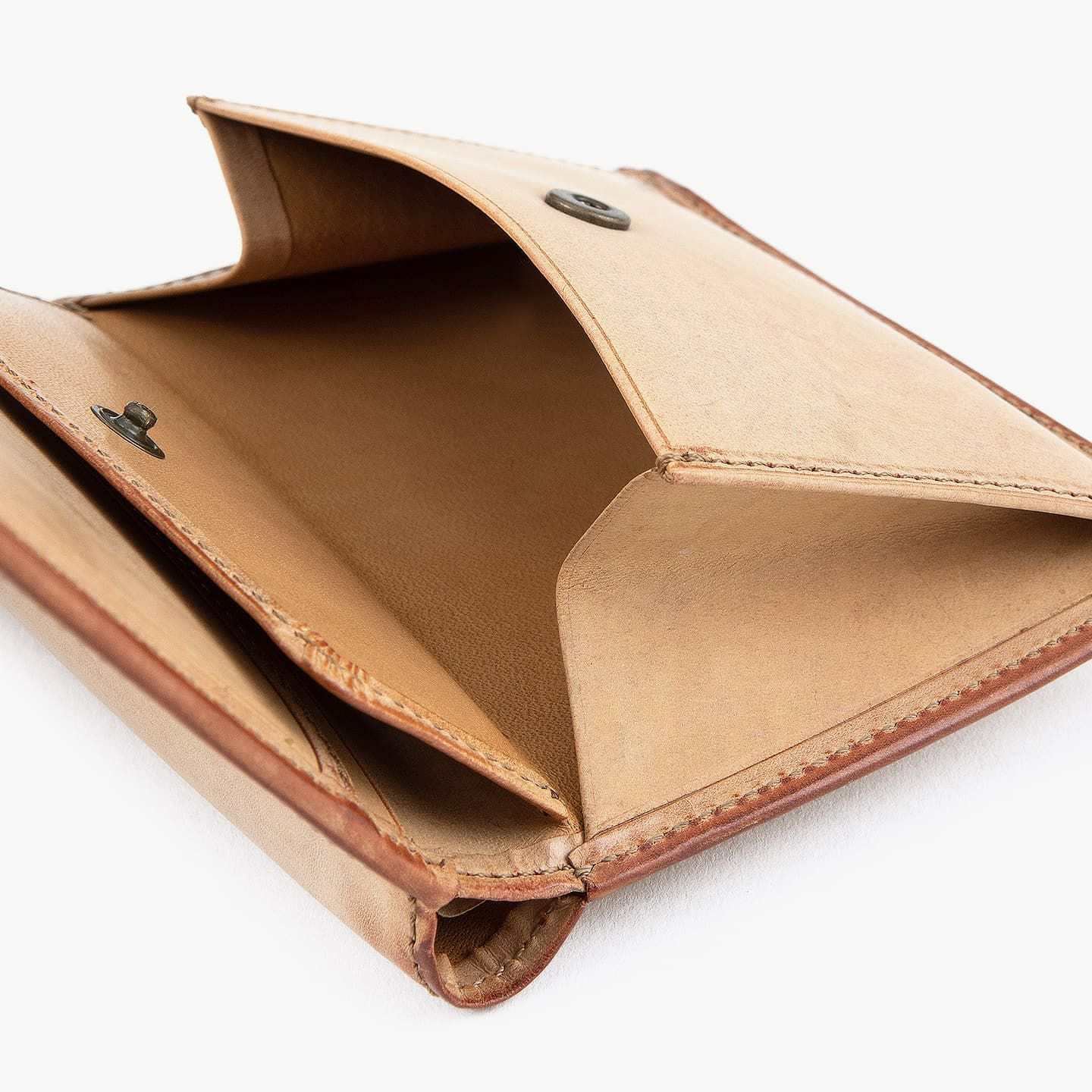 イタリア・トスカーナ地方サンタクローチェ地区のタンナー、イタルペル社製の「トゥクソン・ワックス」。繊維密度が高く丈夫なダブルショルダー(成牛の肩部)を用い、伝統的なバケッタ製法で作られたフルベジタブルタンニン鞣し牛革の表皮に、時間をかけてパラフィンワックスを垂らしながら仕上げています。バームクーヘンの作り方のように、ロールにして回しながら上からワックスを滴下していく技法で、回転させる加減により常温時に白くなるワックスが白い濃淡が生まれて、個性的な表情を創出。使用前の淡白い風合いと、使い込んで革色の浮き出てきた風合いが、劇的に変化する個性的な素材で、ワックスが革の内部に溶け込んで、革だけでは表現できない独特なツヤが魅力です。また、ダブルショルダーは首に近い部位でもあるので、“トラ目”と呼ばれる原皮のシワも味として残ることがあり、アイテムとして新たな楽しみ方も見つけられます。