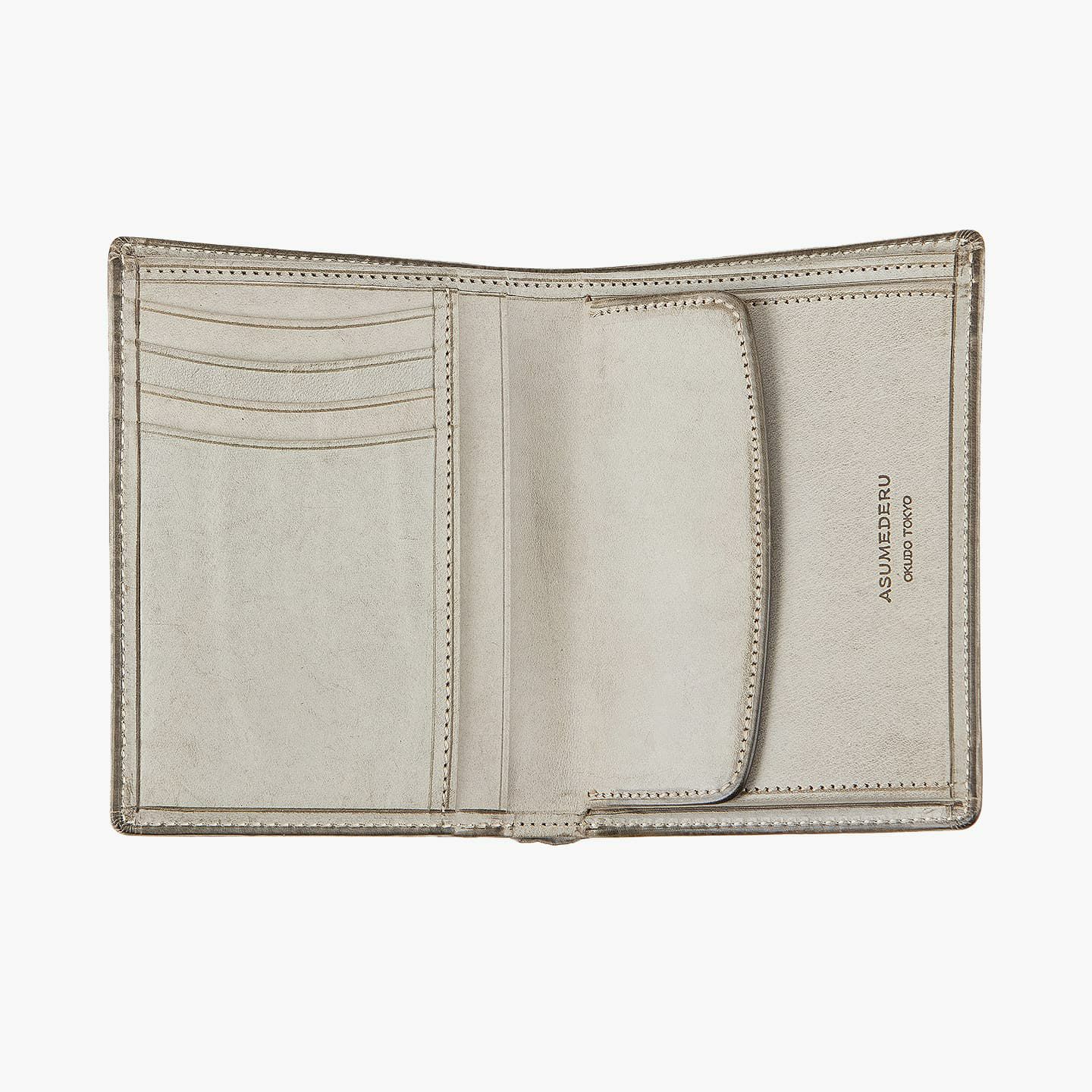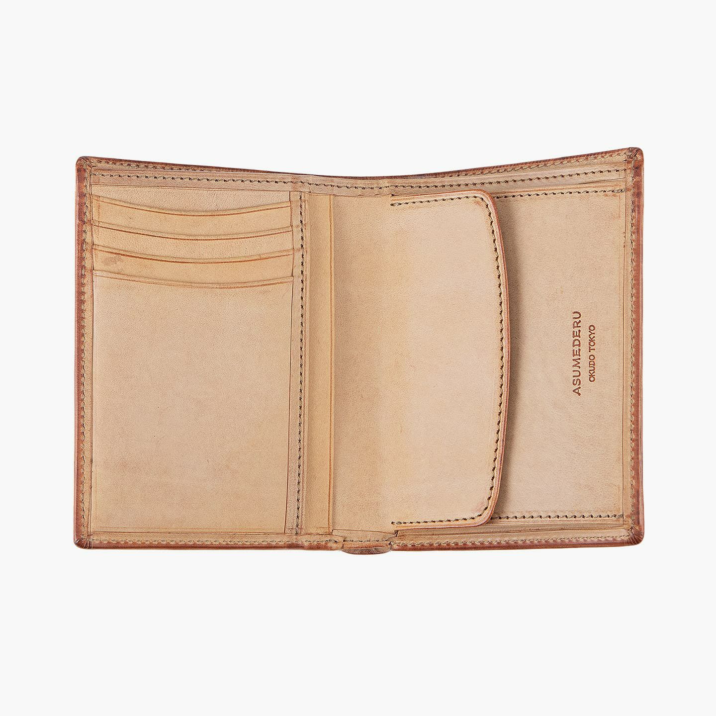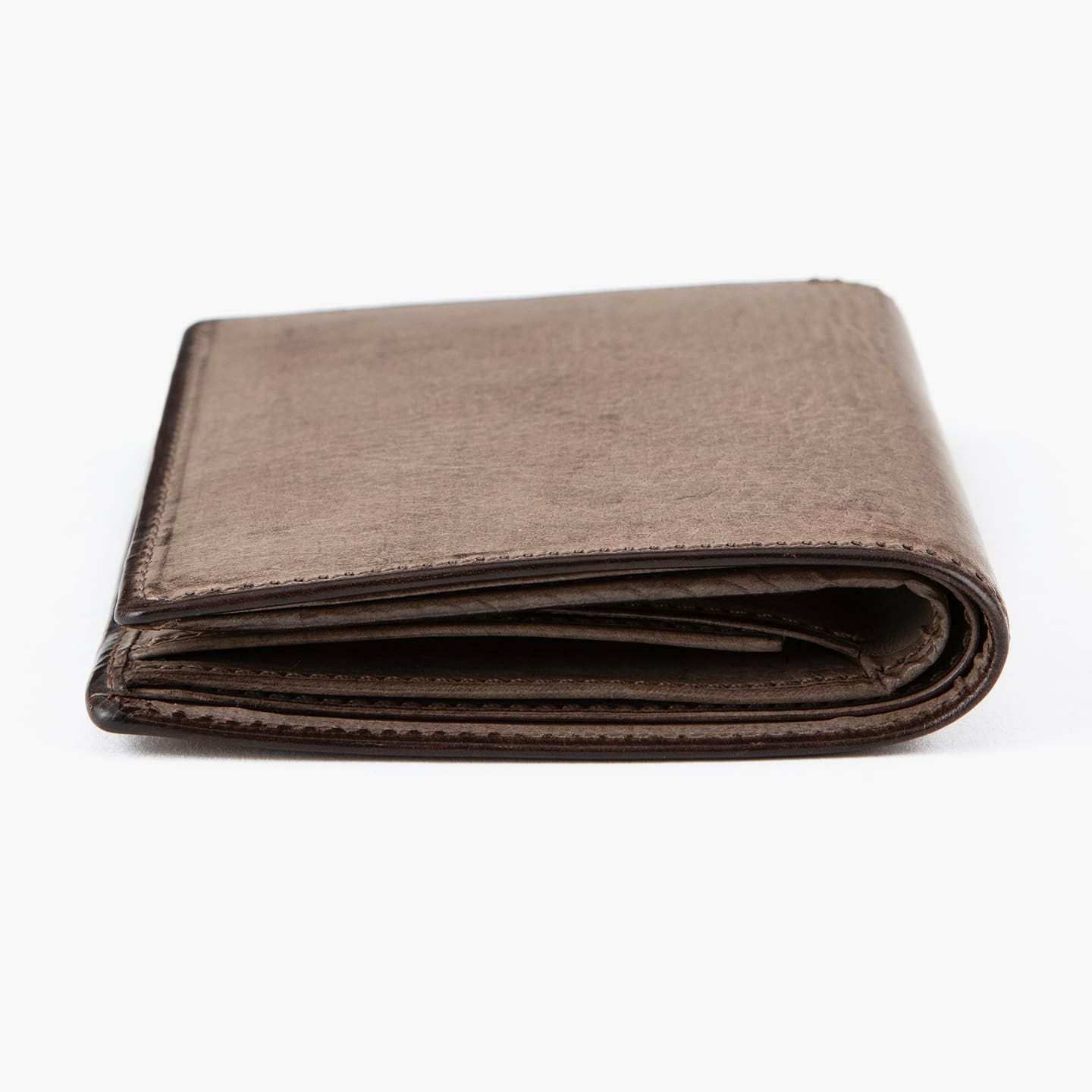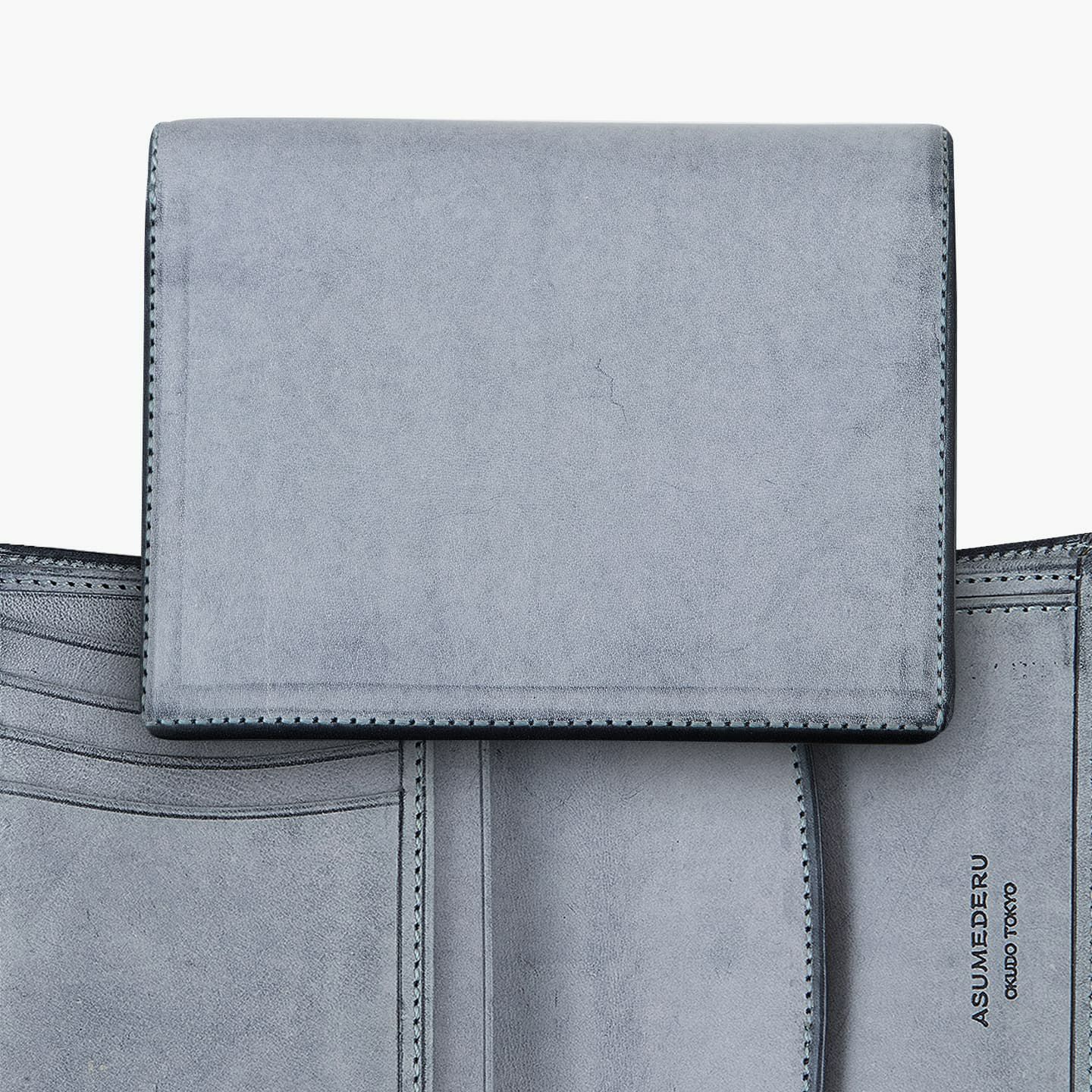 イタリア・トスカーナ地方サンタクローチェ地区のタンナー、イタルペル社製の「トゥクソン・ワックス」。繊維密度が高く丈夫なダブルショルダー(成牛の肩部)を用い、伝統的なバケッタ製法で作られたフルベジタブルタンニン鞣し牛革の表皮に、時間をかけてパラフィンワックスを垂らしながら仕上げています。バームクーヘンの作り方のように、ロールにして回しながら上からワックスを滴下していく技法で、回転させる加減により常温時に白くなるワックスが白い濃淡が生まれて、個性的な表情を創出。使用前の淡白い風合いと、使い込んで革色の浮き出てきた風合いが、劇的に変化する個性的な素材で、ワックスが革の内部に溶け込んで、革だけでは表現できない独特なツヤが魅力です。また、ダブルショルダーは首に近い部位でもあるので、“トラ目”と呼ばれる原皮のシワも味として残ることがあり、アイテムとして新たな楽しみ方も見つけられます。