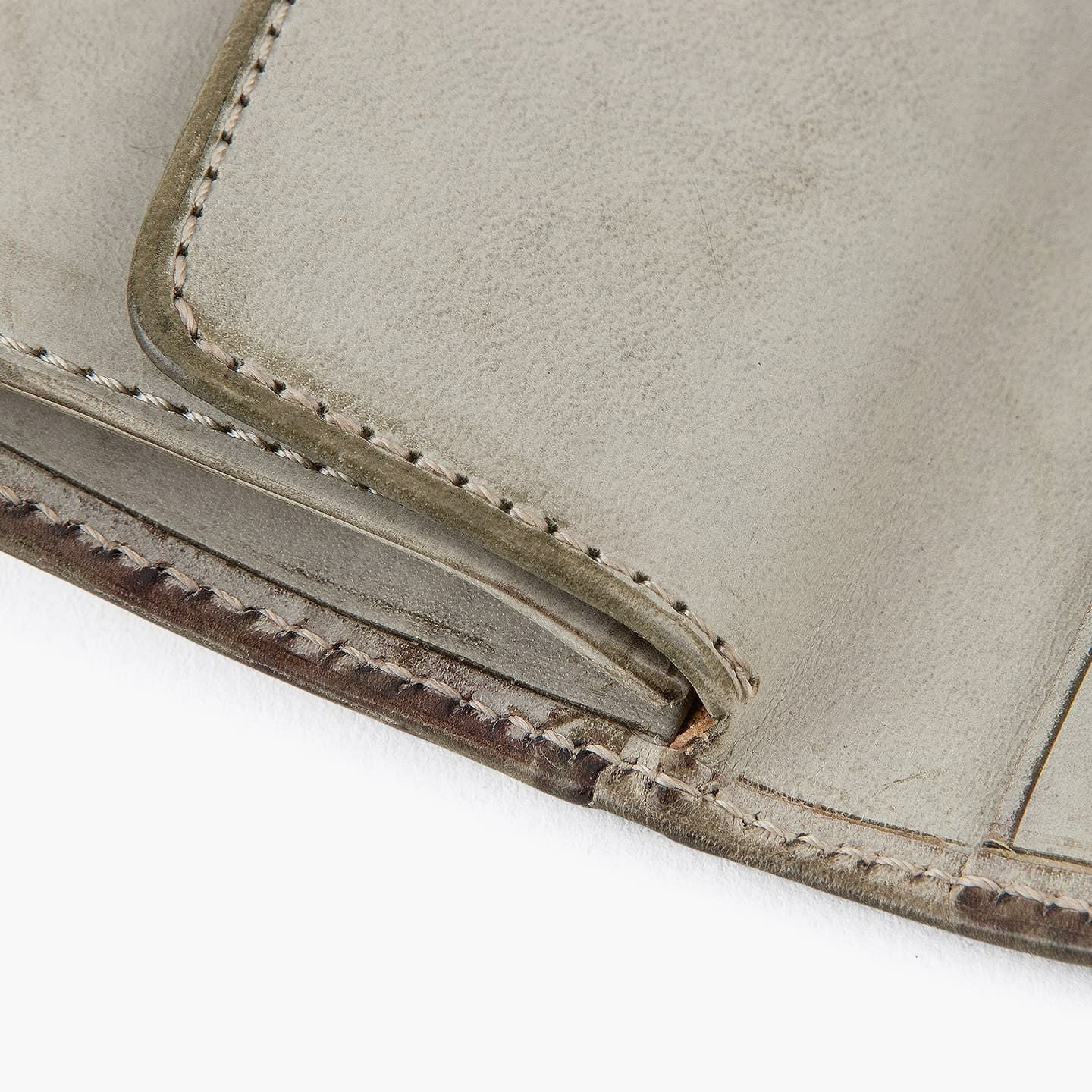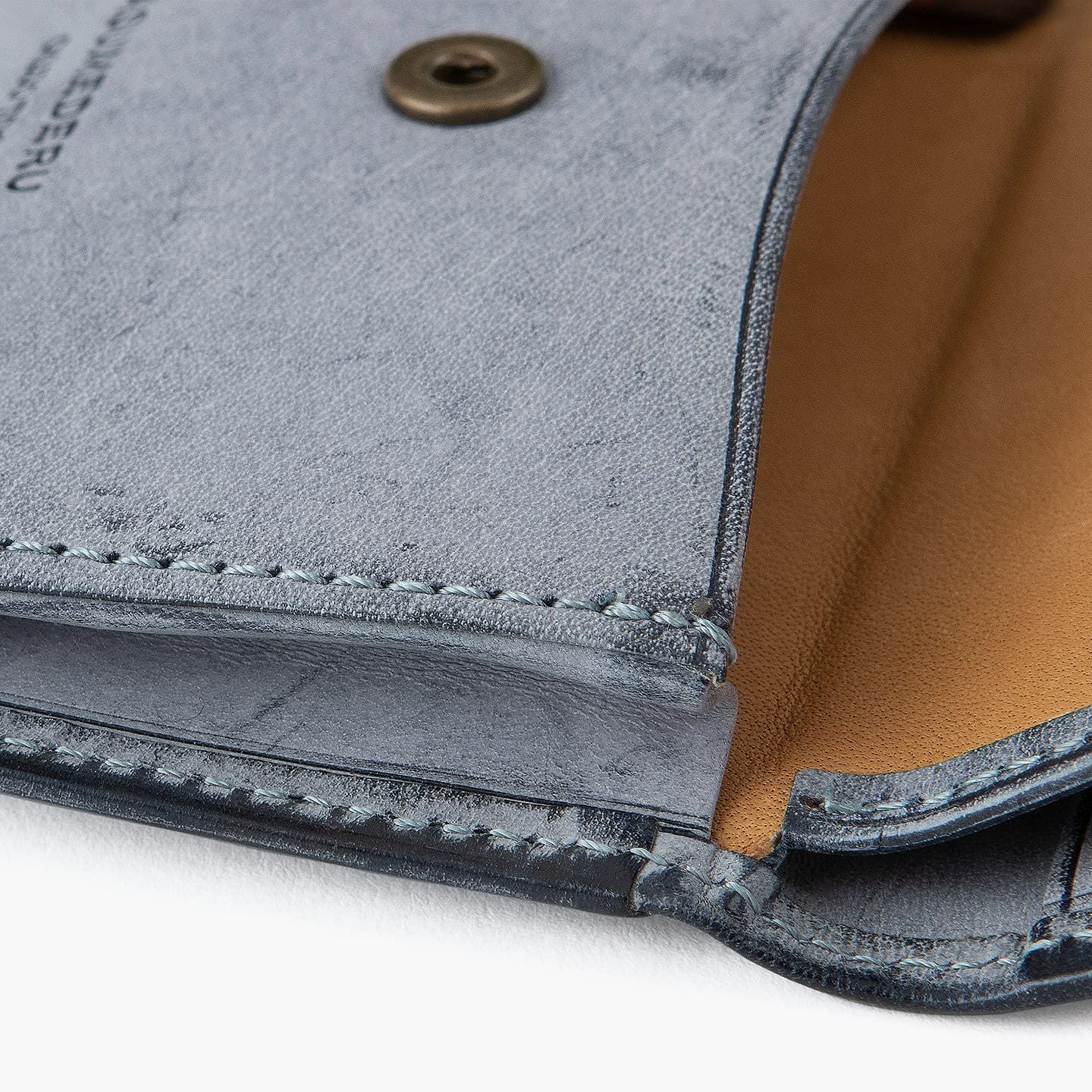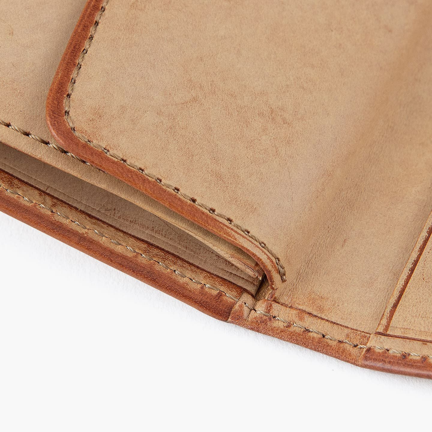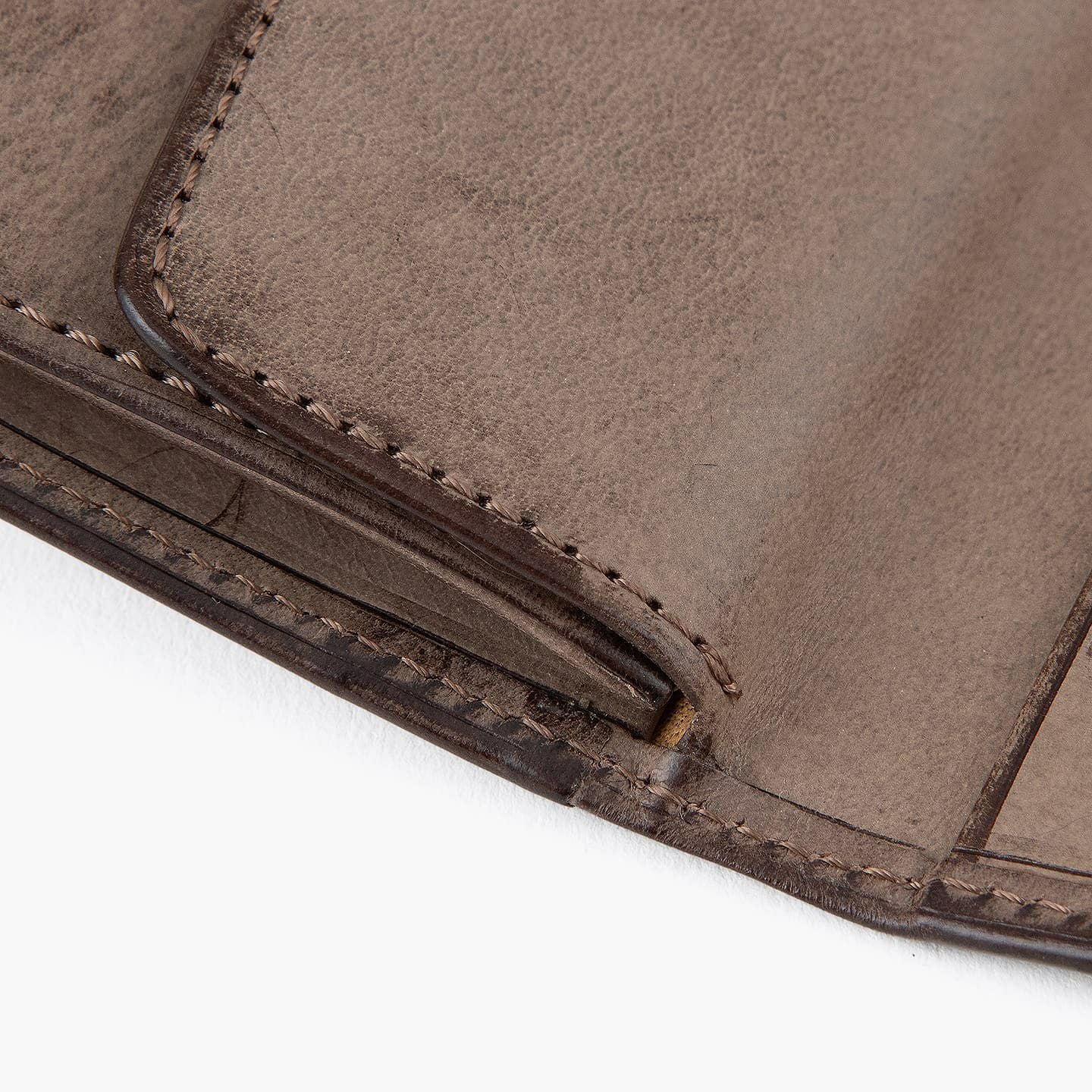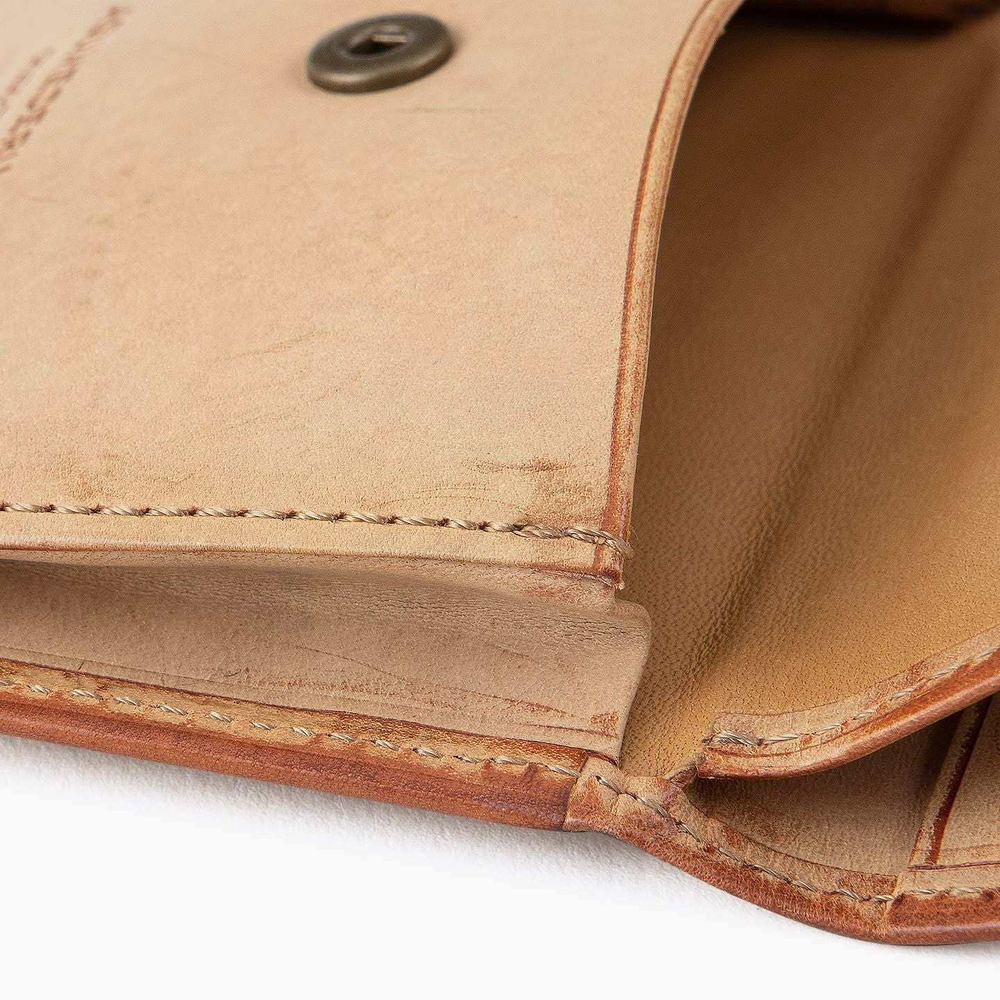 イタリア・トスカーナ地方サンタクローチェ地区のタンナー、イタルペル社製の「トゥクソン・ワックス」。繊維密度が高く丈夫なダブルショルダー(成牛の肩部)を用い、伝統的なバケッタ製法で作られたフルベジタブルタンニン鞣し牛革の表皮に、時間をかけてパラフィンワックスを垂らしながら仕上げています。バームクーヘンの作り方のように、ロールにして回しながら上からワックスを滴下していく技法で、回転させる加減により常温時に白くなるワックスが白い濃淡が生まれて、個性的な表情を創出。使用前の淡白い風合いと、使い込んで革色の浮き出てきた風合いが、劇的に変化する個性的な素材で、ワックスが革の内部に溶け込んで、革だけでは表現できない独特なツヤが魅力です。また、ダブルショルダーは首に近い部位でもあるので、“トラ目”と呼ばれる原皮のシワも味として残ることがあり、アイテムとして新たな楽しみ方も見つけられます。