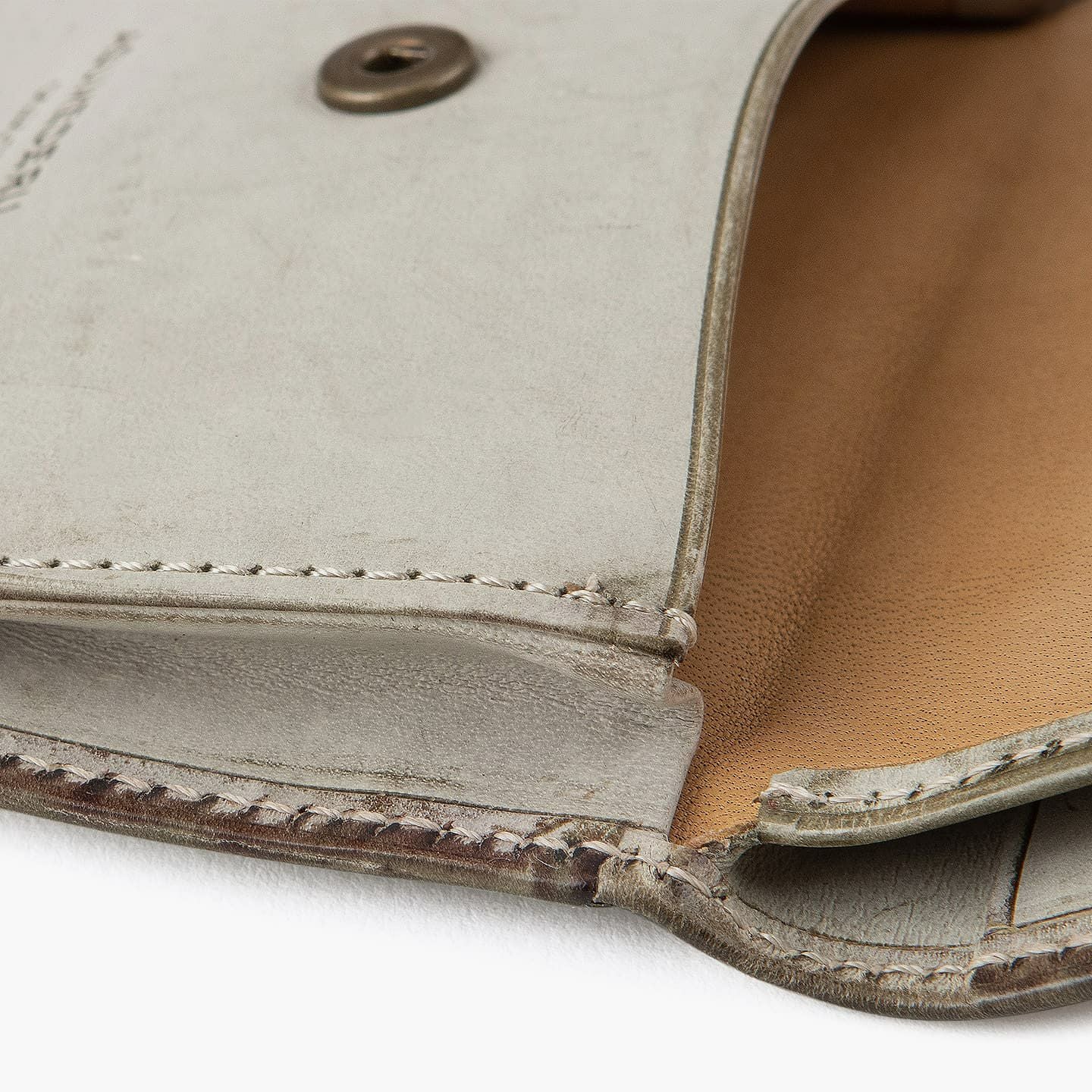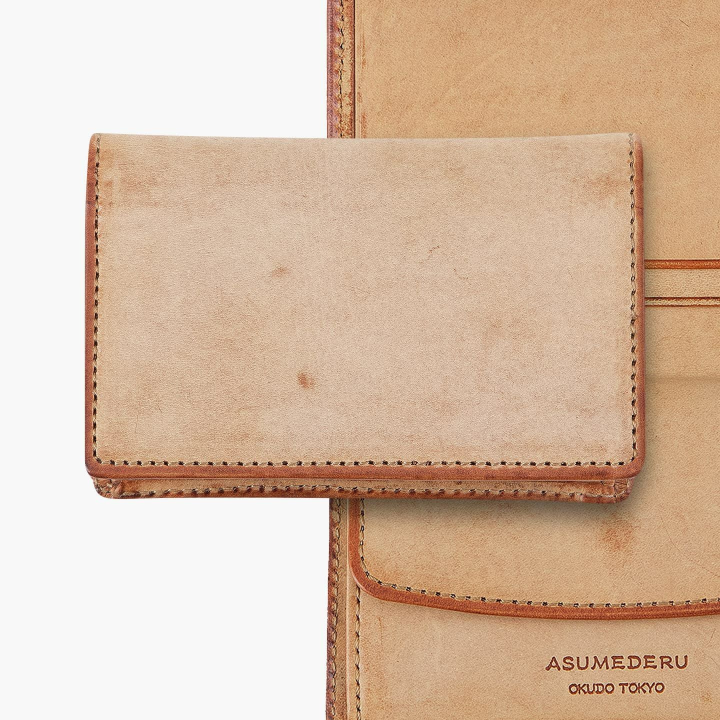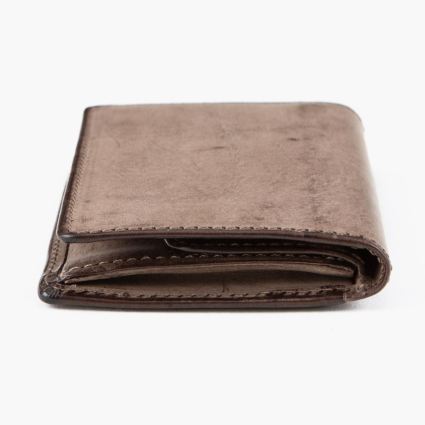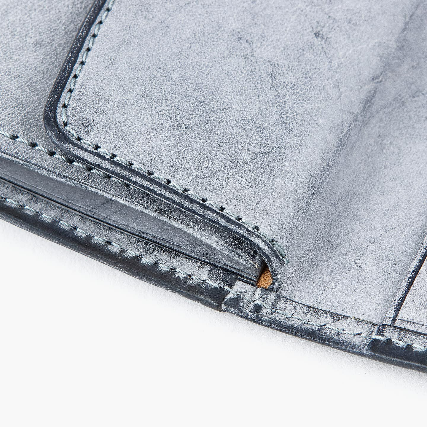 イタリア・トスカーナ地方サンタクローチェ地区のタンナー、イタルペル社製の「トゥクソン・ワックス」。繊維密度が高く丈夫なダブルショルダー(成牛の肩部)を用い、伝統的なバケッタ製法で作られたフルベジタブルタンニン鞣し牛革の表皮に、時間をかけてパラフィンワックスを垂らしながら仕上げています。バームクーヘンの作り方のように、ロールにして回しながら上からワックスを滴下していく技法で、回転させる加減により常温時に白くなるワックスが白い濃淡が生まれて、個性的な表情を創出。使用前の淡白い風合いと、使い込んで革色の浮き出てきた風合いが、劇的に変化する個性的な素材で、ワックスが革の内部に溶け込んで、革だけでは表現できない独特なツヤが魅力です。また、ダブルショルダーは首に近い部位でもあるので、“トラ目”と呼ばれる原皮のシワも味として残ることがあり、アイテムとして新たな楽しみ方も見つけられます。