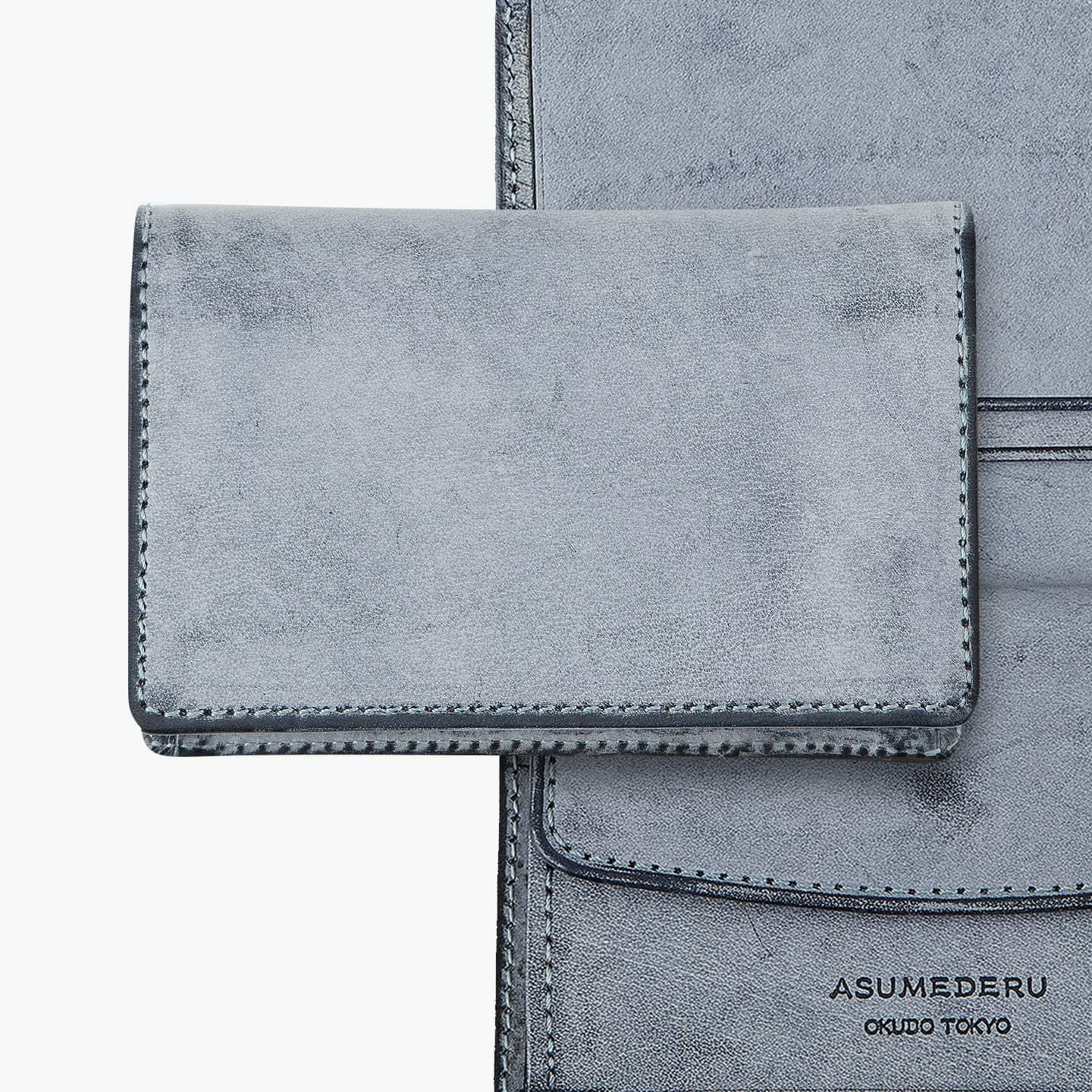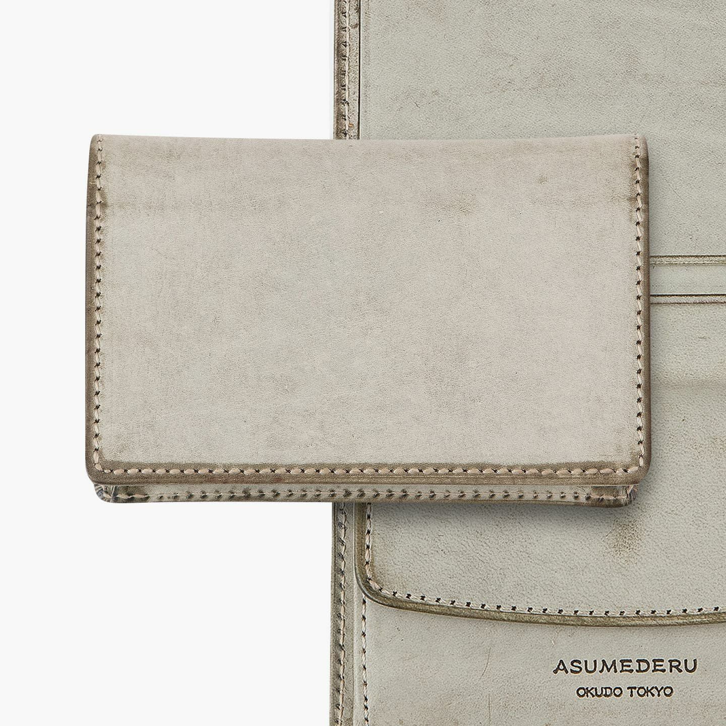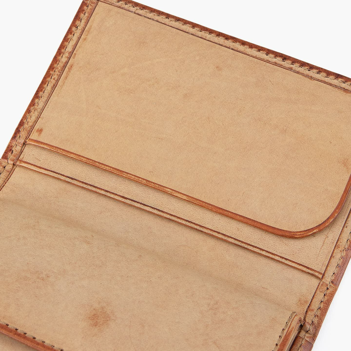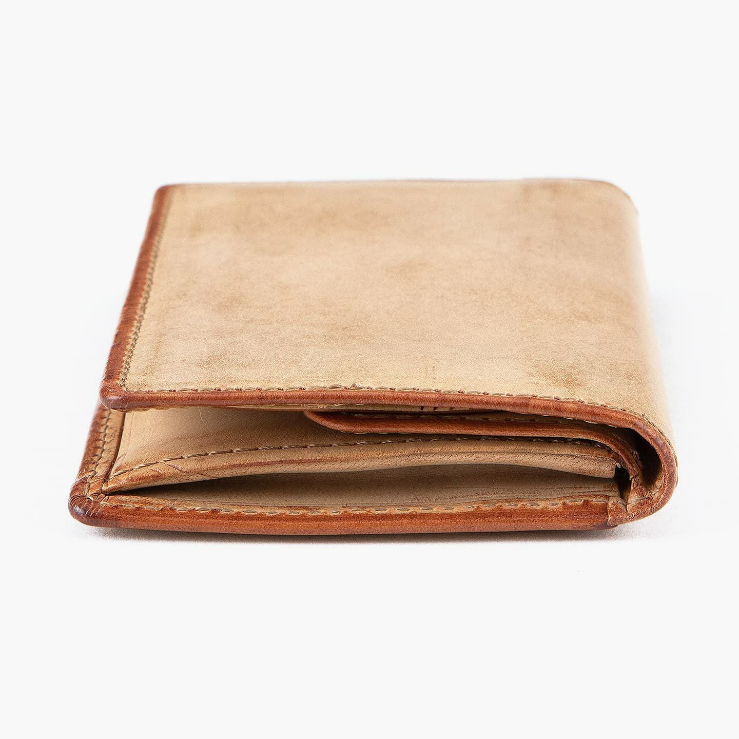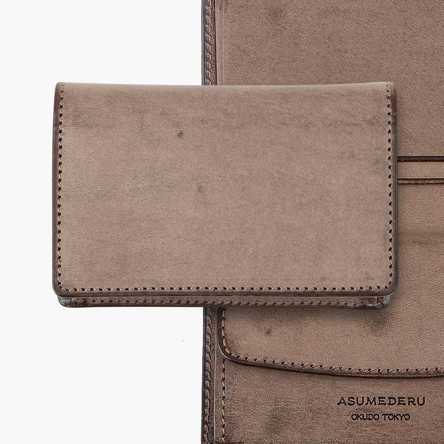 イタリア・トスカーナ地方サンタクローチェ地区のタンナー、イタルペル社製の「トゥクソン・ワックス」。繊維密度が高く丈夫なダブルショルダー(成牛の肩部)を用い、伝統的なバケッタ製法で作られたフルベジタブルタンニン鞣し牛革の表皮に、時間をかけてパラフィンワックスを垂らしながら仕上げています。バームクーヘンの作り方のように、ロールにして回しながら上からワックスを滴下していく技法で、回転させる加減により常温時に白くなるワックスが白い濃淡が生まれて、個性的な表情を創出。使用前の淡白い風合いと、使い込んで革色の浮き出てきた風合いが、劇的に変化する個性的な素材で、ワックスが革の内部に溶け込んで、革だけでは表現できない独特なツヤが魅力です。また、ダブルショルダーは首に近い部位でもあるので、“トラ目”と呼ばれる原皮のシワも味として残ることがあり、アイテムとして新たな楽しみ方も見つけられます。