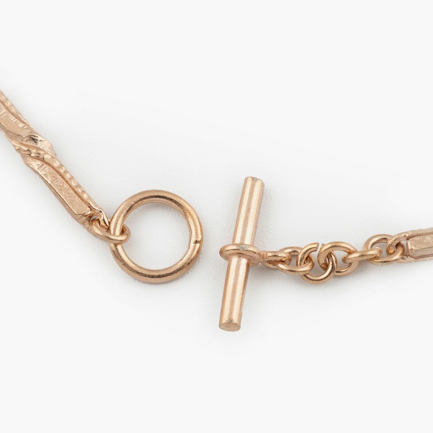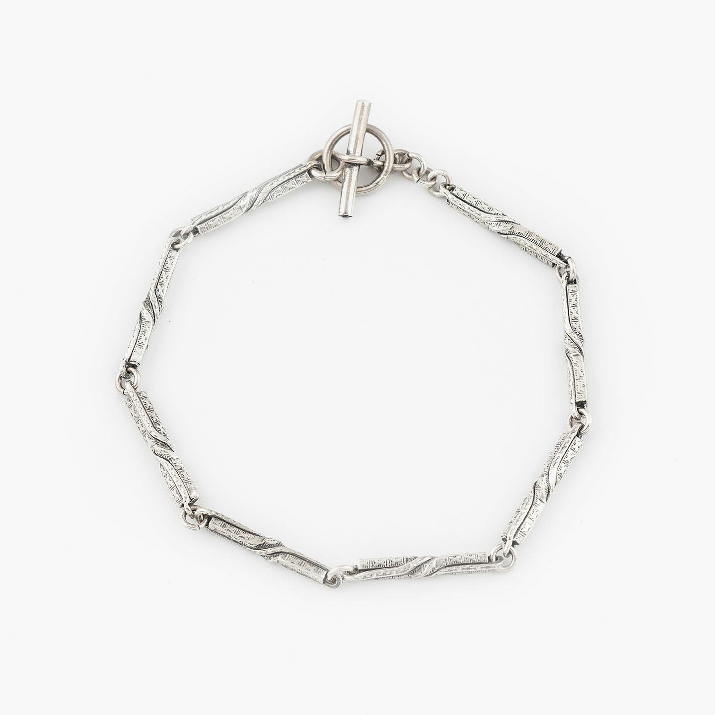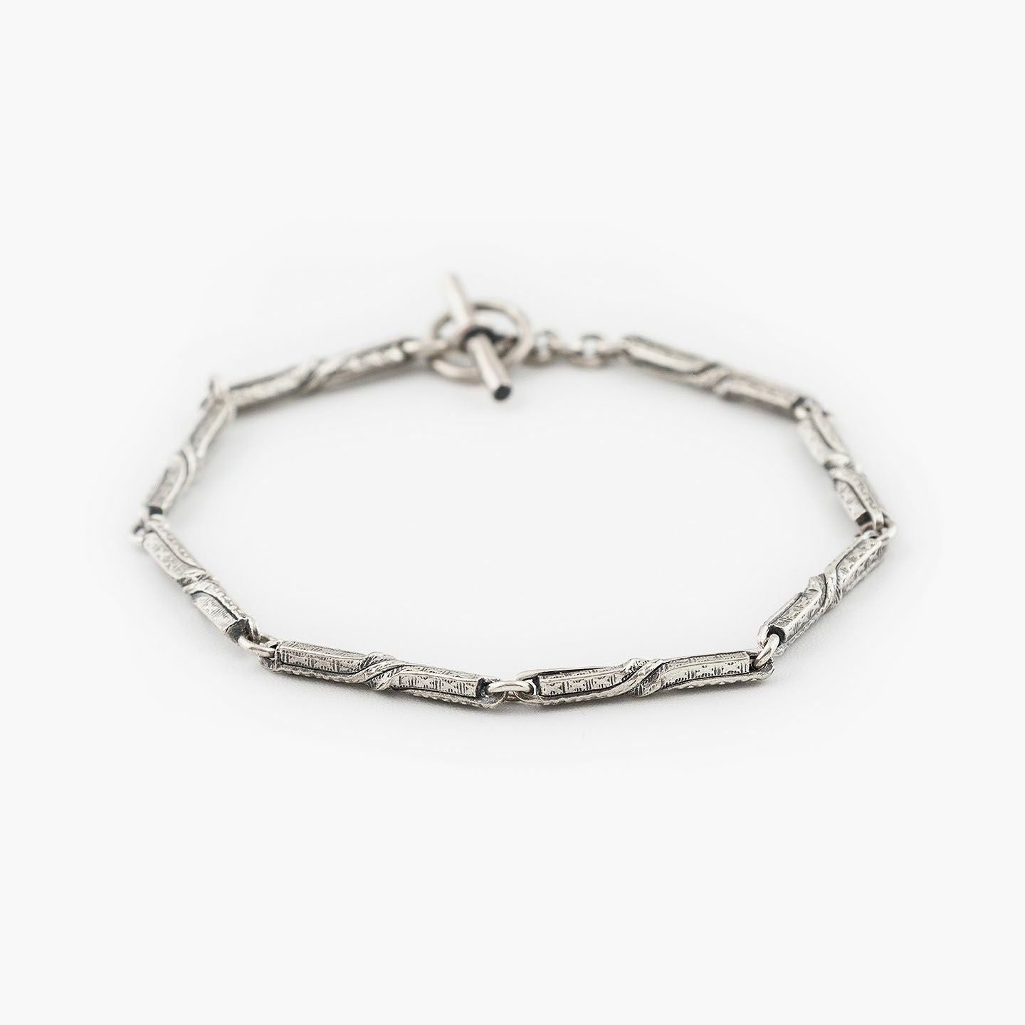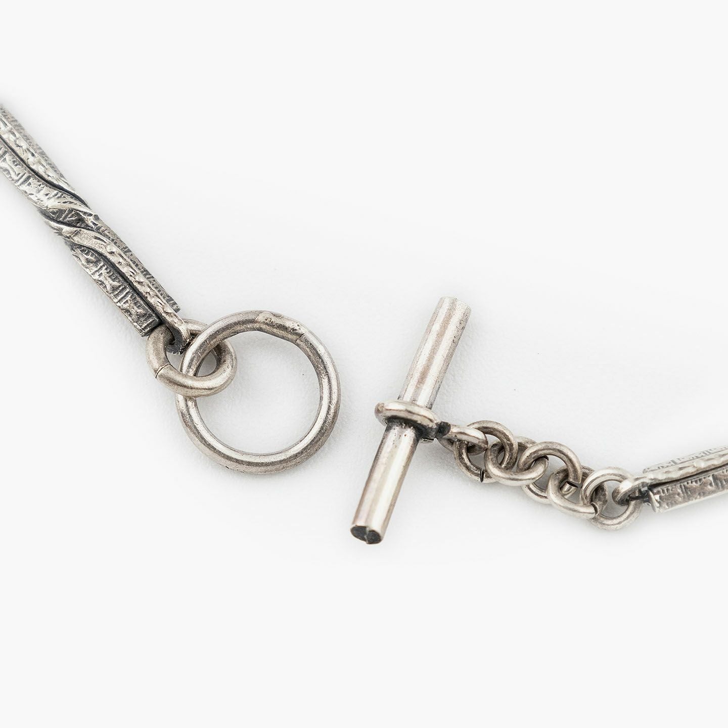 職人・川上健が魂を込めて、デザイン的にも機能的にも楽しめる商品作りを心がけ、後世まで長く使えるアイテムを手掛けているブランド『ajina』のチェーンブレスレット。西欧アンティーク調の雰囲気を醸す細かな細工が施された意匠は、歴史ある懐中時計のチェーンをモチーフにして、高度な職人技が成せる既製品にはない比類なきディテールで、さらに捻りを加えた味な洒落感が、独特の高級感とともにスタイリッシュさも創出。Silver925/K10PGの2マテリアルとS・M・Lの3サイズからセレクトできる自分らしい個性と、クラシカルなTバーの留め具とともに骨董品を腕に纏うかのような味わい深い魅力が、この上ない愛着感を育んでくれる。