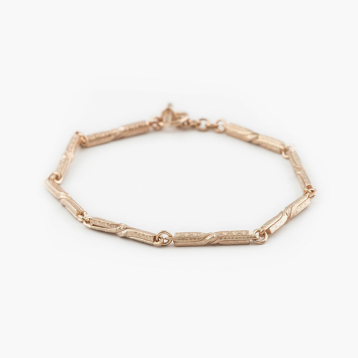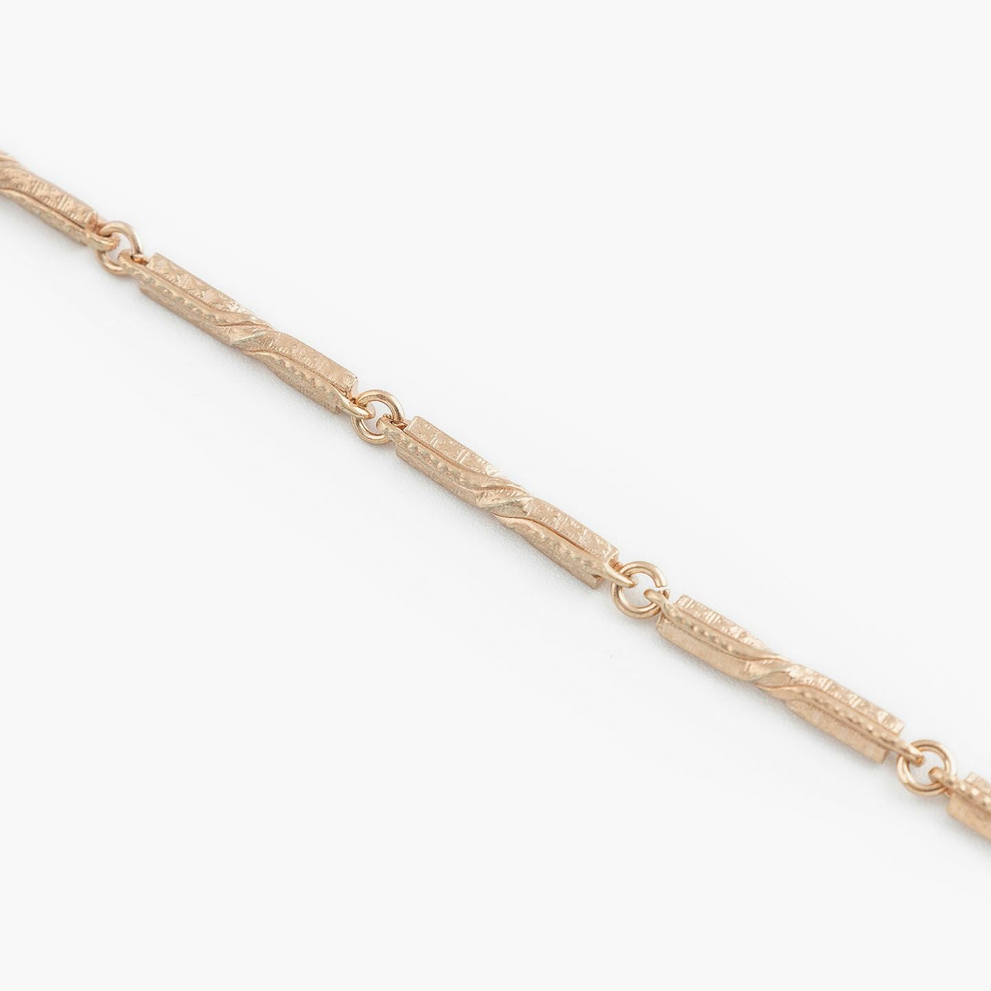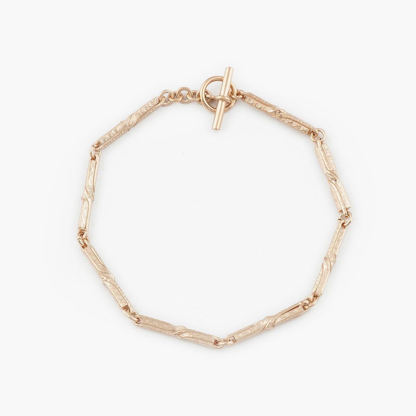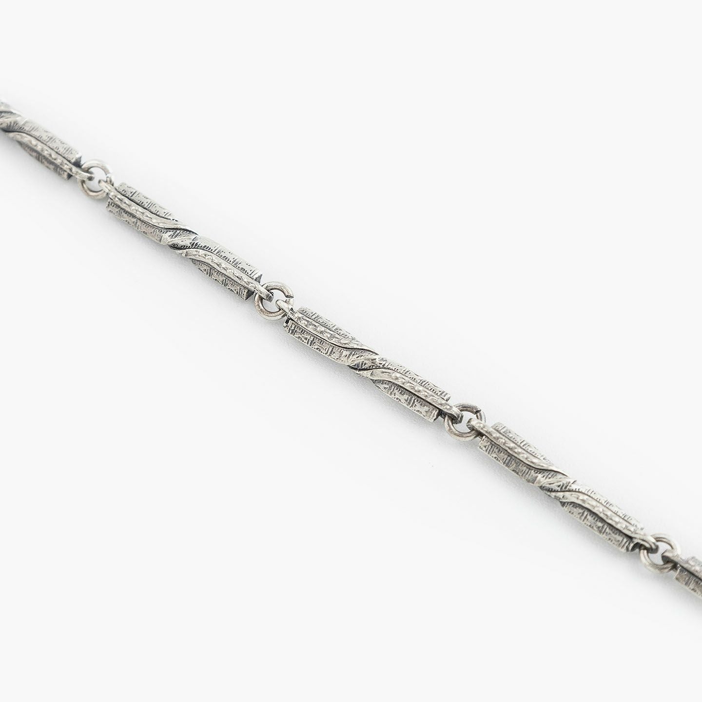 職人・川上健が魂を込めて、デザイン的にも機能的にも楽しめる商品作りを心がけ、後世まで長く使えるアイテムを手掛けているブランド『ajina』のチェーンブレスレット。西欧アンティーク調の雰囲気を醸す細かな細工が施された意匠は、歴史ある懐中時計のチェーンをモチーフにして、高度な職人技が成せる既製品にはない比類なきディテールで、さらに捻りを加えた味な洒落感が、独特の高級感とともにスタイリッシュさも創出。Silver925/K10PGの2マテリアルとS・M・Lの3サイズからセレクトできる自分らしい個性と、クラシカルなTバーの留め具とともに骨董品を腕に纏うかのような味わい深い魅力が、この上ない愛着感を育んでくれる。