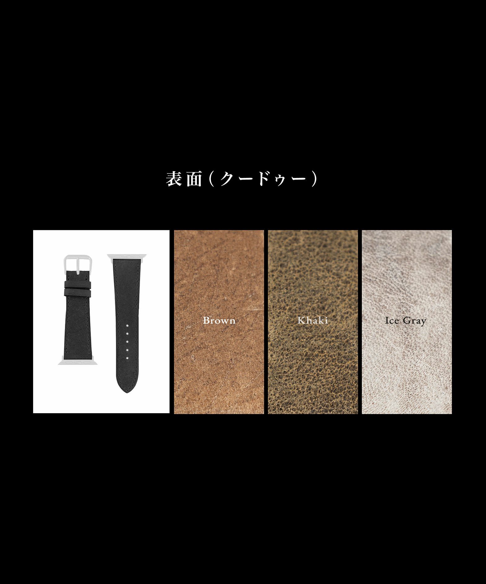 とても丈夫で美しい手縫いの芸術「クチュール・セリエ」で、2.0mmのフラットなフォルムを仕上げた、シックなデザインの時計ベルト。洗練されたアップルウォッチと合わせることで、エレガントな高級感を演出してくれます。また、手首周りサイズを6種類から選択できるとともに、「アダプター & 尾鍵」「アダプター & Dバックル」のいずれかを、Silver/Gold/Black/Rose Goldの4色から選んでオーダーできるのも魅力。さらに、表面の「クードゥー」は3色から、裏面の「ツェルマット」は2色から、それぞれセレクトして、自分らしいカラーリングで腕周りを引き立てられます。