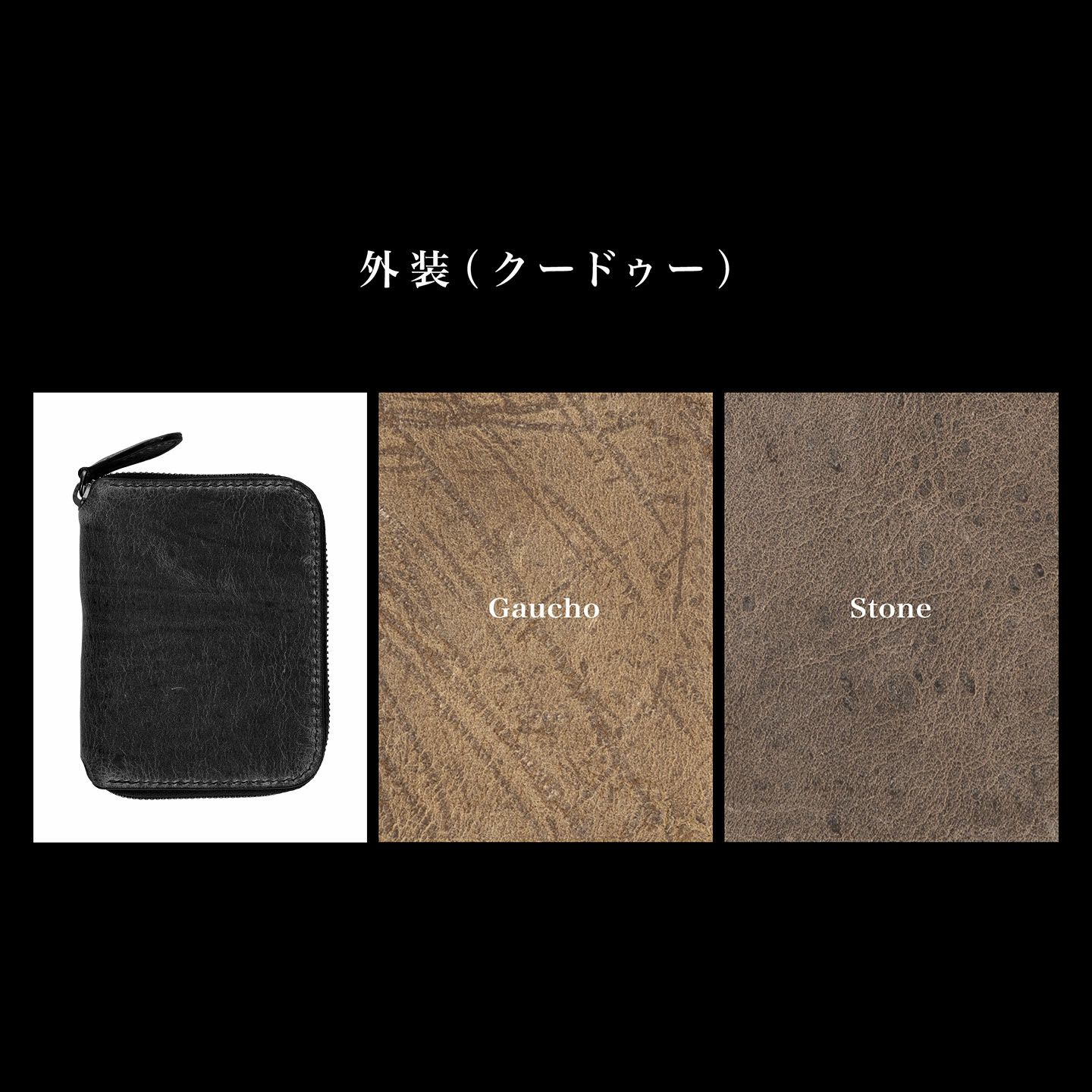 コンパクトなサイズ感でありながら、紙幣・小銭・カードなどを可能な限り収納できる設計を追求。紙幣を挟めるホルダー付きの札スペースや、マチ付きで収納力があるフラップ&ホック式の小銭入れ、カード数枚を差し込めるループとともに、ループユニット裏・小銭入れ裏・札スペース裏にもカードポケットを設けているカード収納など、それぞれに独自の工夫が施されています。また、収納物を包む込む安心なラウンドファスナー仕様で、外装革をあしらった開閉しやすいユニークな形状の引き手も魅力。さらに、外装は手縫い・その他はミシン仕立てにして、パーツごとに最適な縫製を使い分けたり、革の厚みもパーツごとに調整したりして、使い心地や使用感にもこだわり抜くなど、高度な技術を誇る職人としての美学も凝縮されています。
