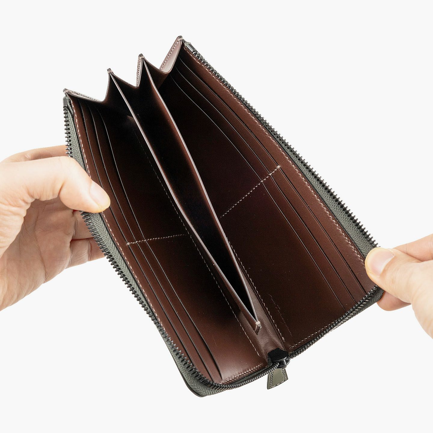誰が見ても世界一ハイクオリティなモノ作りを追求している、若き職人の手仕事による、愚直で真面目なブランド『rai takayama』のL字ジップロングウォレット。ブルームが印象的なイギリスの味わい深いブライドルレザー「バーミンガム」を外装として纏い、重厚感のある風合いながら柔らかめで手に馴染むやすく、使い込むほどにブルームがなくなりツヤ感を漂わせていくのも魅力。外装装飾としての片マチ部と内装には、高級感あふれるエレガントな雰囲気のイタリアンスムースレザー「イングラサット」を採用。使いやすく飽きのこないシンプルなデザインを、丁寧な総手縫いやマットブラックのコバなどのディテールにこだわる美学が引き立て、普段使いを格上げしてくれる。